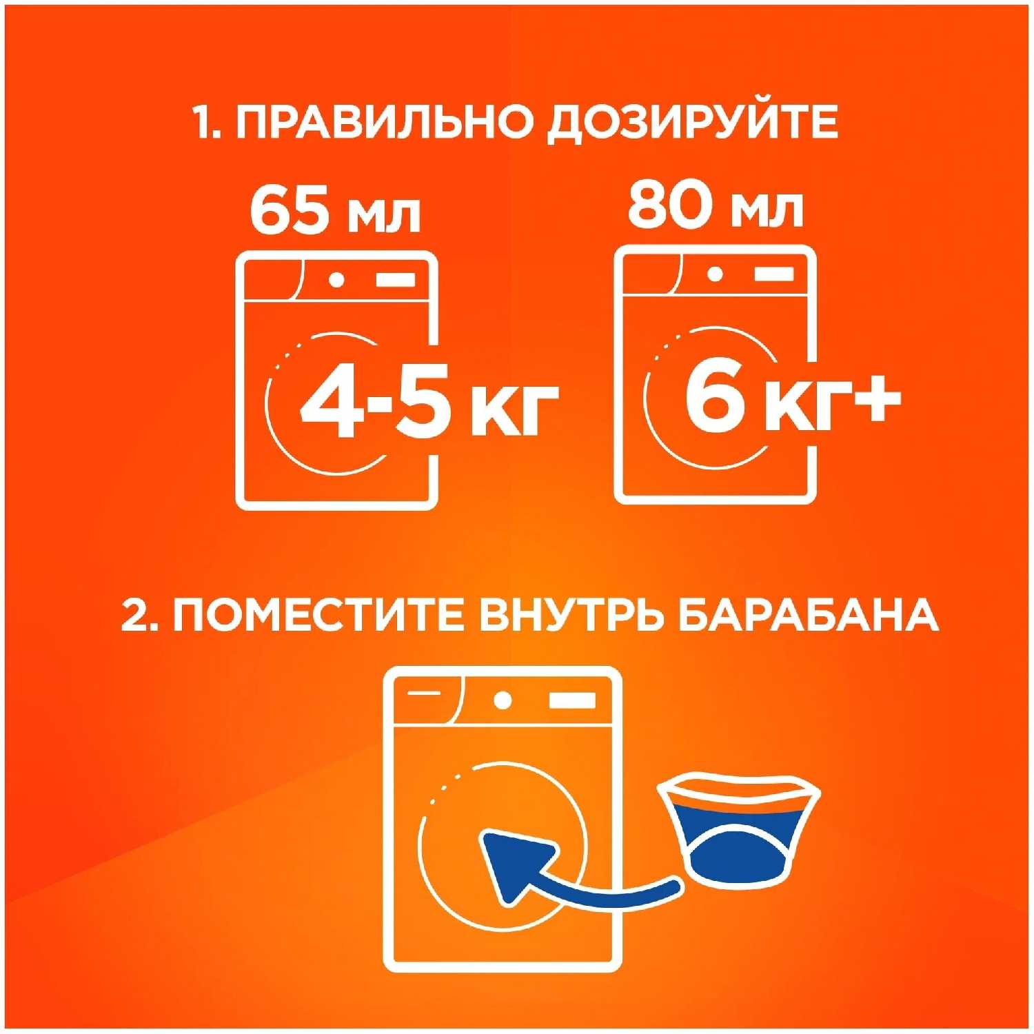 Эргономика и дозирование: Бутылка геля с рифленой ручкой и прозрачным индикатором уровня обеспечивает удобный захват и контроль расхода. Мерный стаканчик (в комплекте) позволяет точно отмерять дозу для машинной загрузки 4-5 кг – 60-80 мл достаточно при умеренных загрязнениях. Капсулы исключают необходимость дозирования: трехкамерная конструкция (синий/фиолетовый/белый гель) автоматически высвобождает компоненты в нужной пропорции.