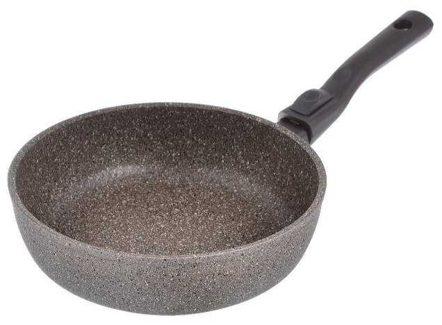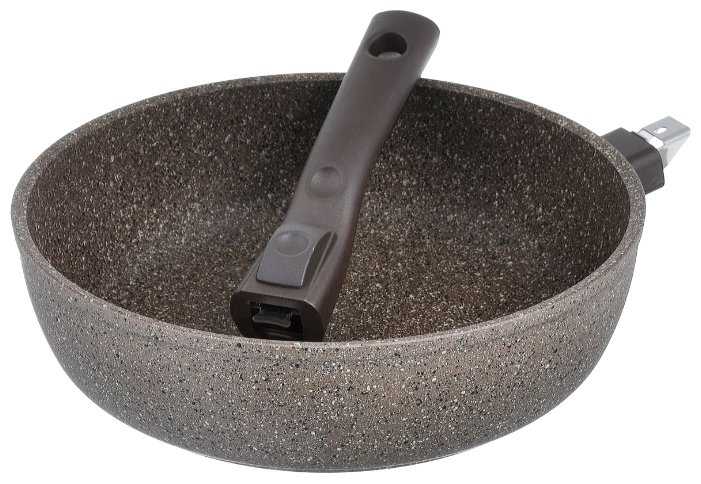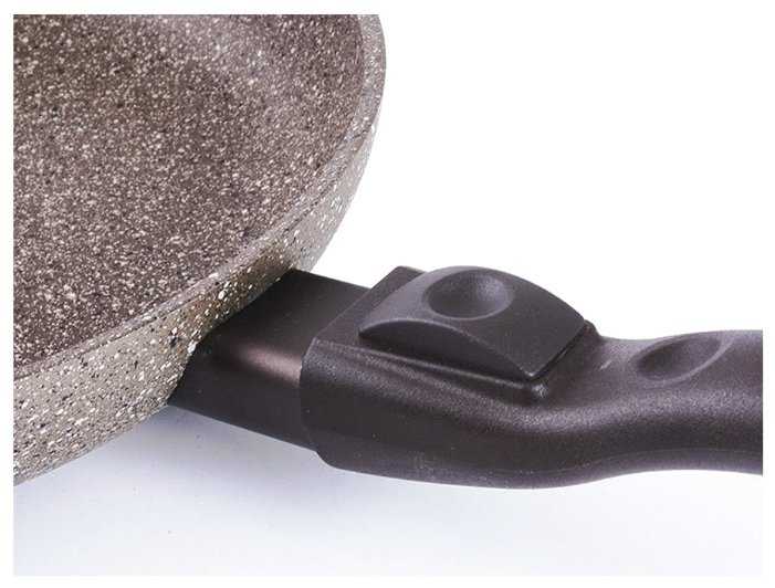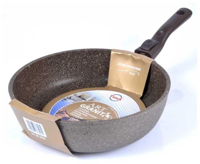 - + Антипригарная, тяжёлая, как чугунная, высокие бортики, съёмная ручка.