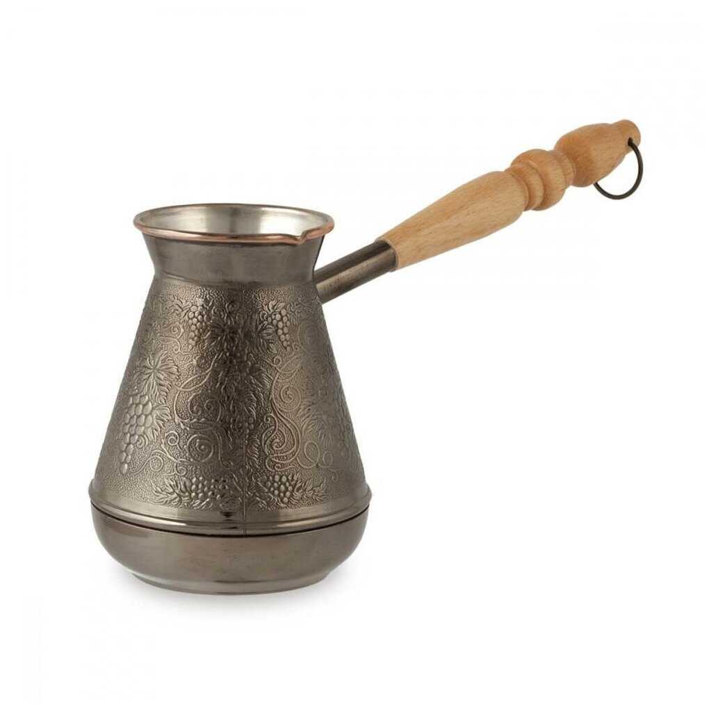 удобная и практичная турка, на одну порцию. медная. симпатичная. в такой приятно верить кофе по утрам. рекомендую.