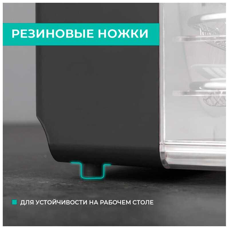 - Боковое расположение вентилятора обеспечивает равномерную просушку без перестановки лотков.