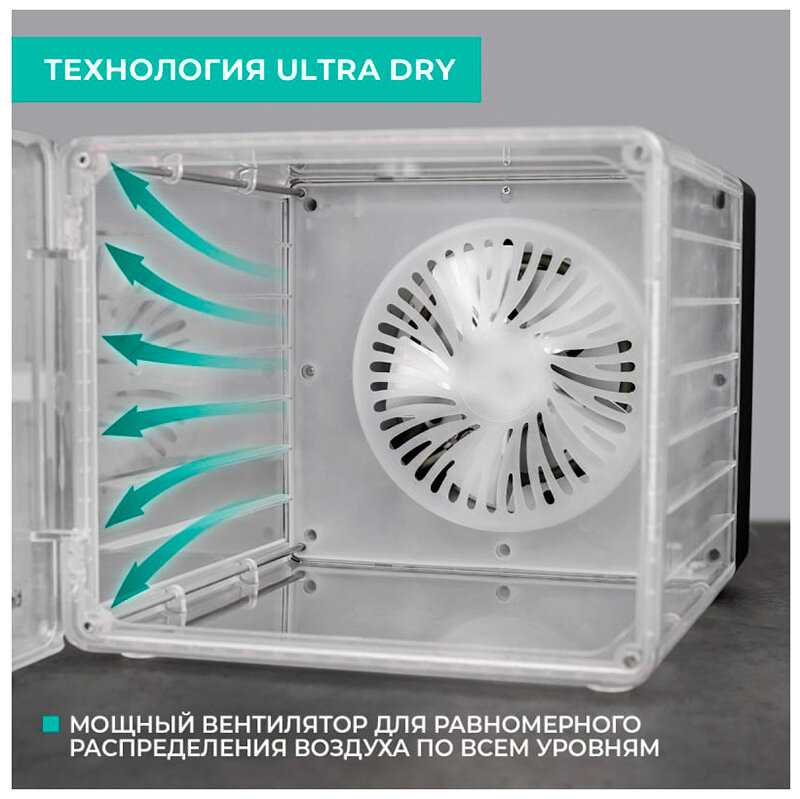 - Боковое расположение вентилятора обеспечивает равномерную просушку без перестановки лотков.