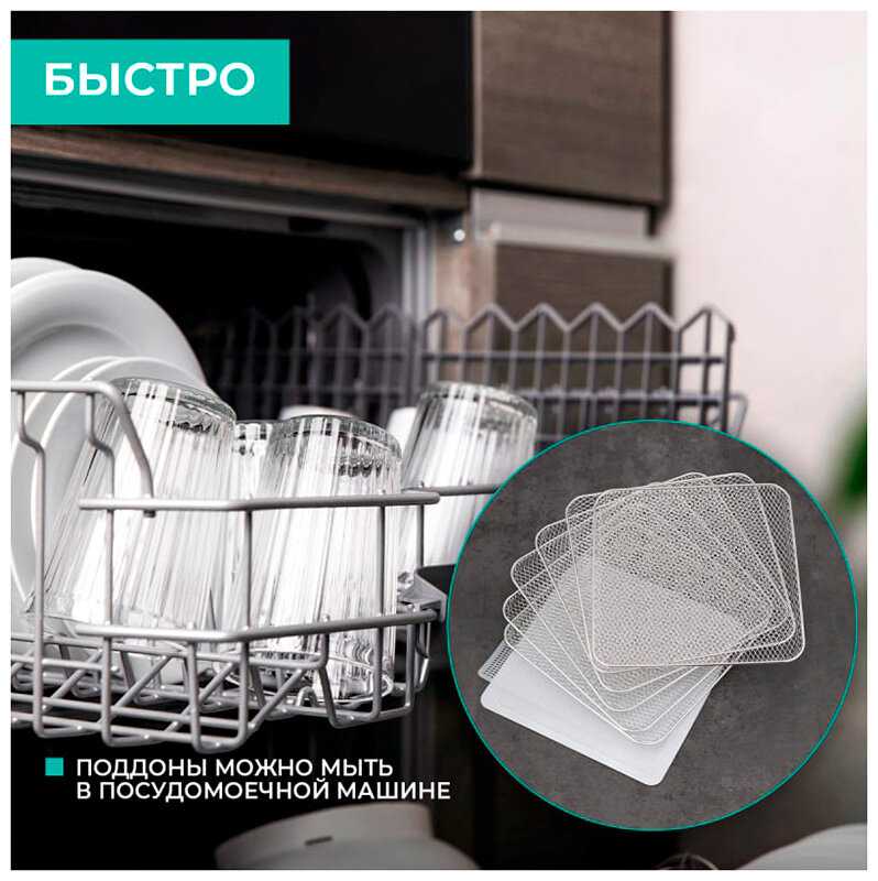- Несмотря на небольшой размер, 8 поддонов позволяют сушить большой объем (до 1 кг мокрых продуктов).