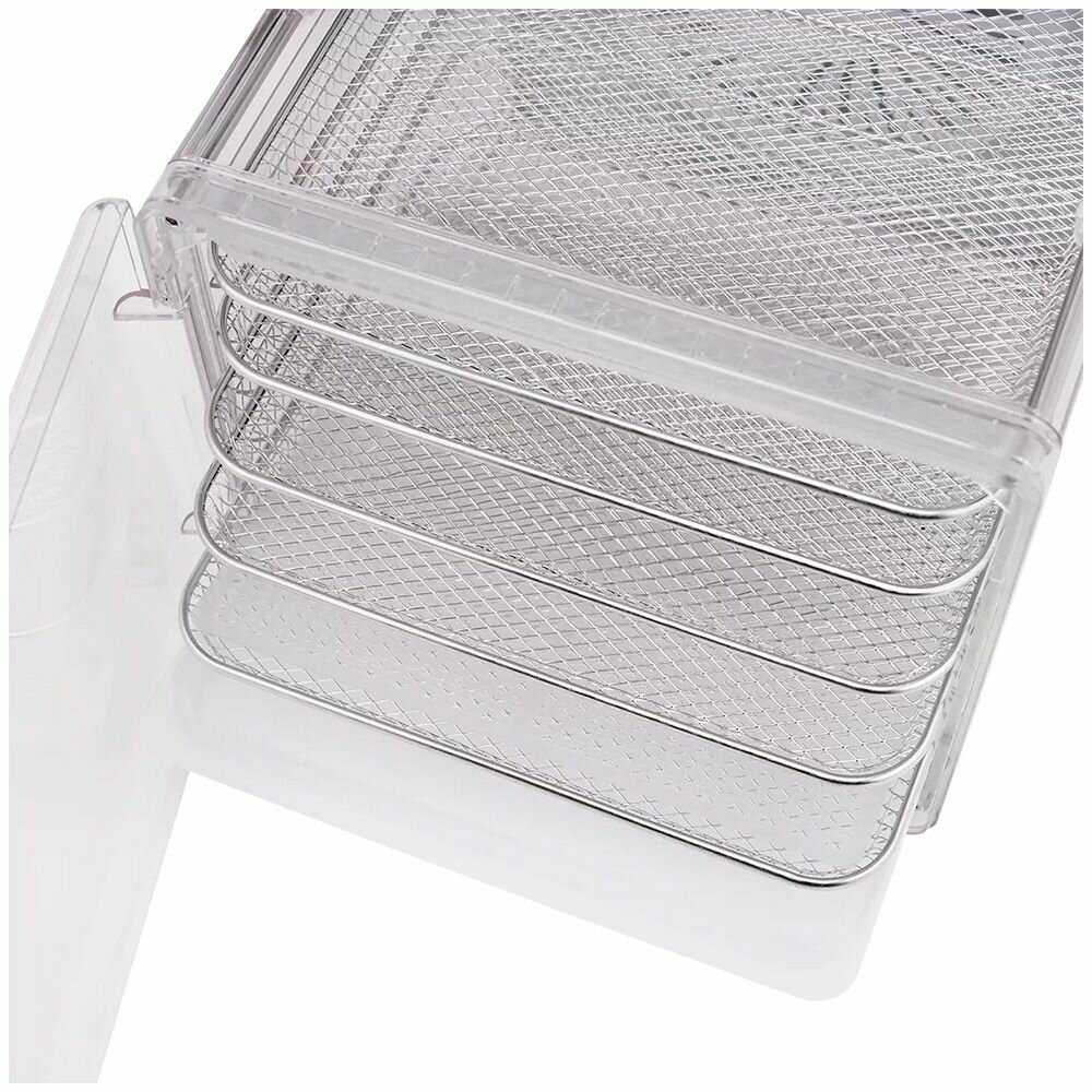 Прозрачные стенки позволяют наблюдать за процессом сушки без открытия, контролируя готовность по внешнему виду. Пользователи ценят это для лучшего результата с фруктами и овощами. Видимость со всех сторон упрощает эксплуатацию. -