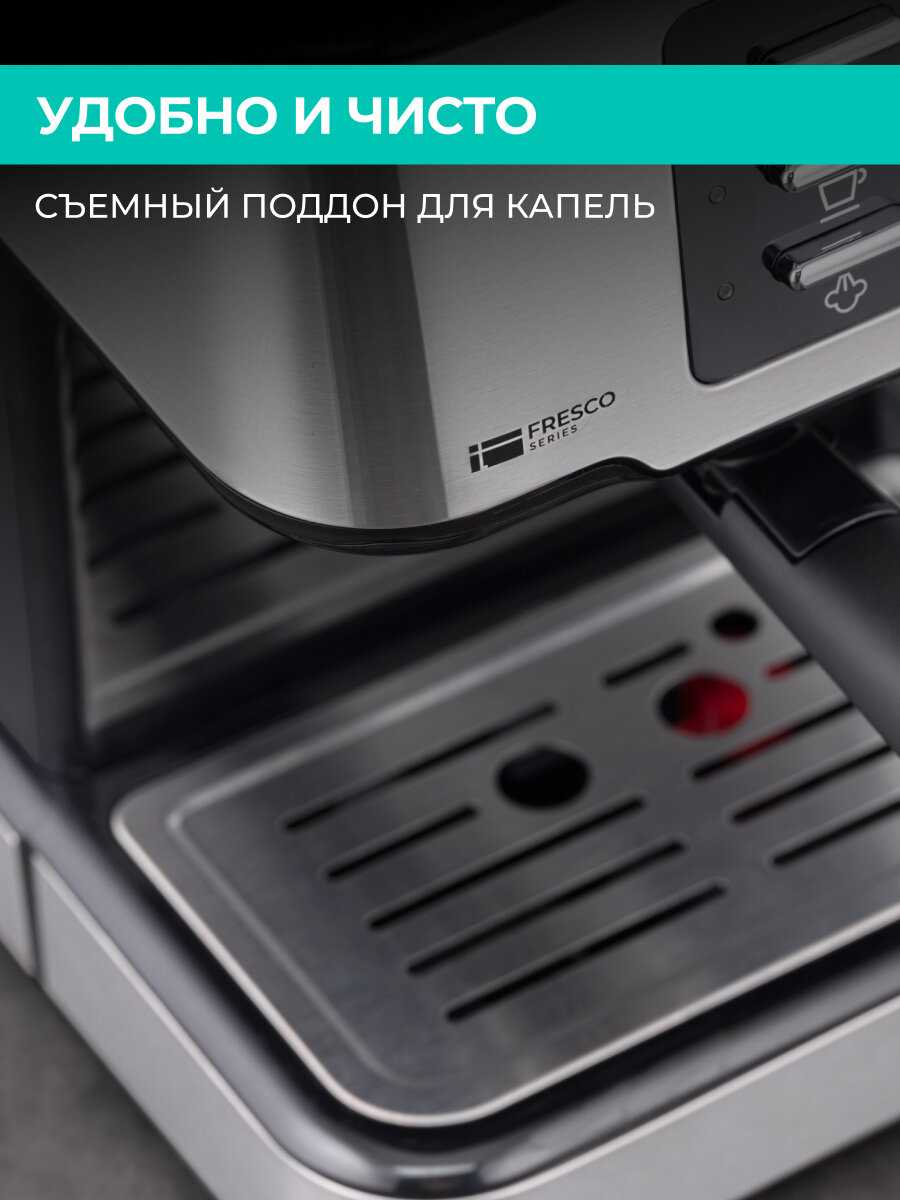 - Мощная помпа обеспечивает насыщенную экстракцию даже при среднем помоле зерен.