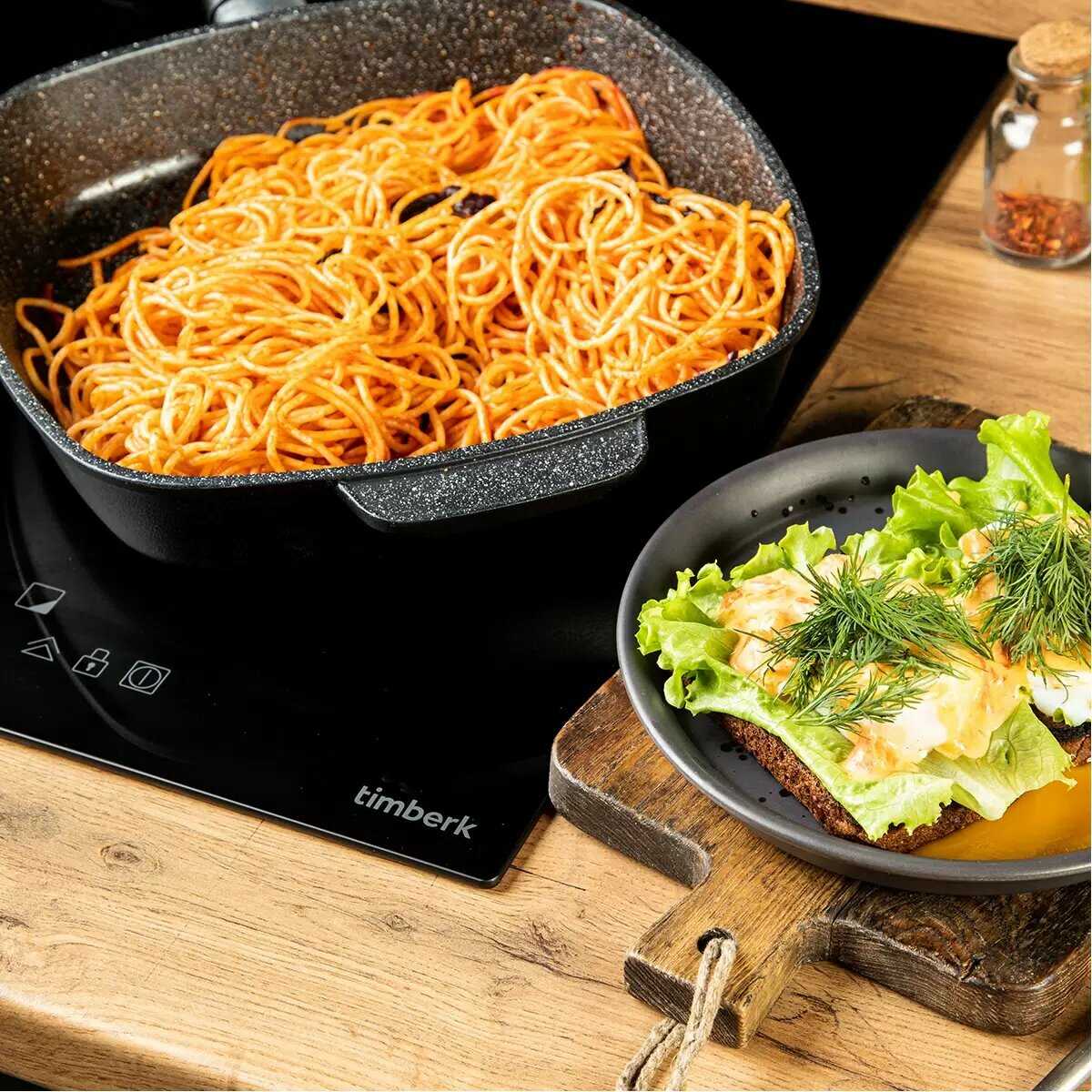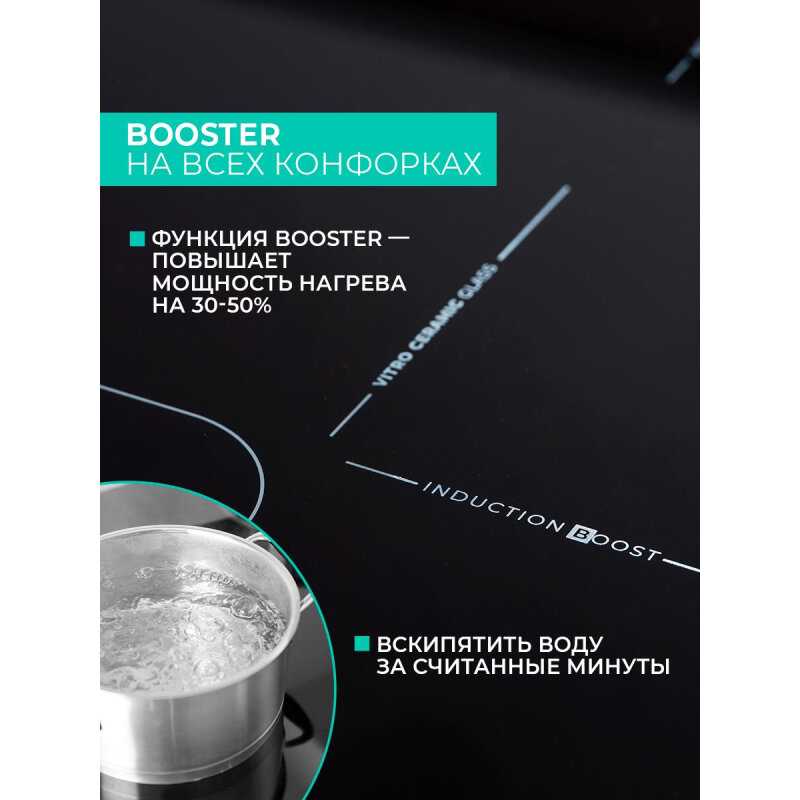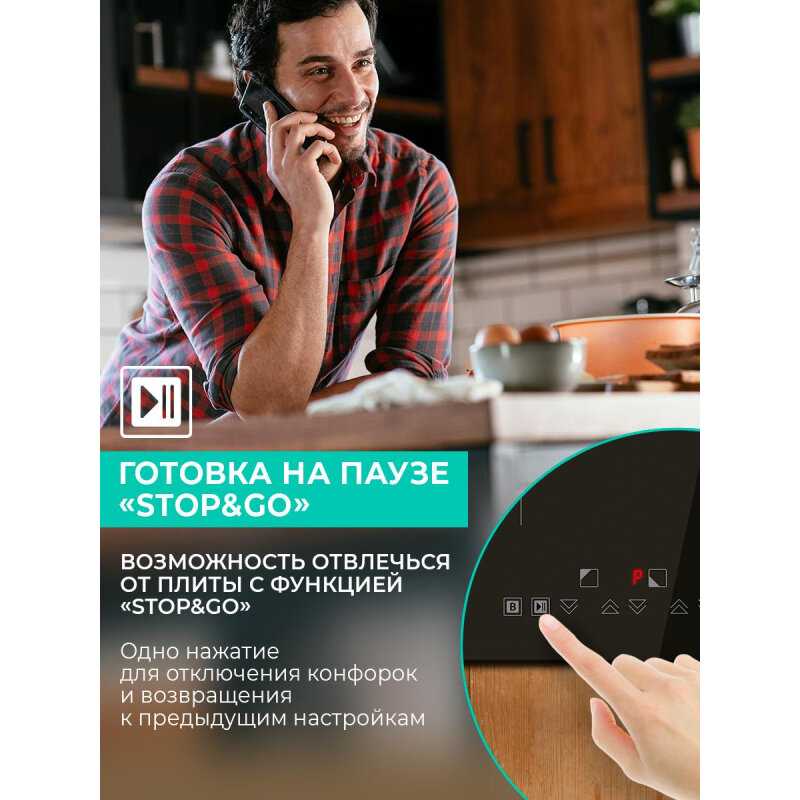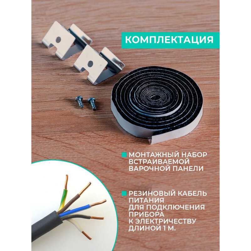 Есть все функции для комфортного приготовления: бустер (форсировка мощности), таймер отключения, пауза в приготовлении, блокировка от детей, защита от перегрева и перелива, индикация остаточного тепла. Обозначения и индикация видны четко и интуитивно понятно. В комплектации все необходимое для подключения и эксплуатации: инструкция, крепежи, уплотнитель, кабель.