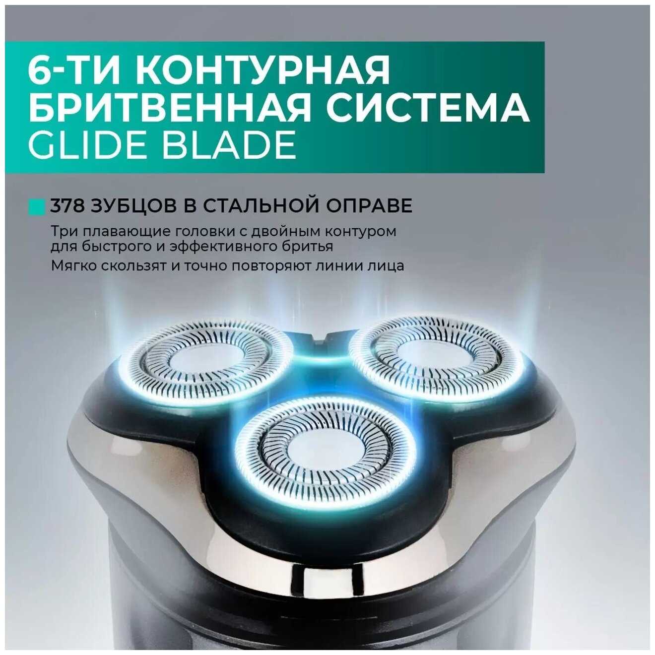 - Плавающие тройные головки обеспечивают плотное прилегание к контурам лица, устраняя порезы и покраснения даже при движении против роста волос.