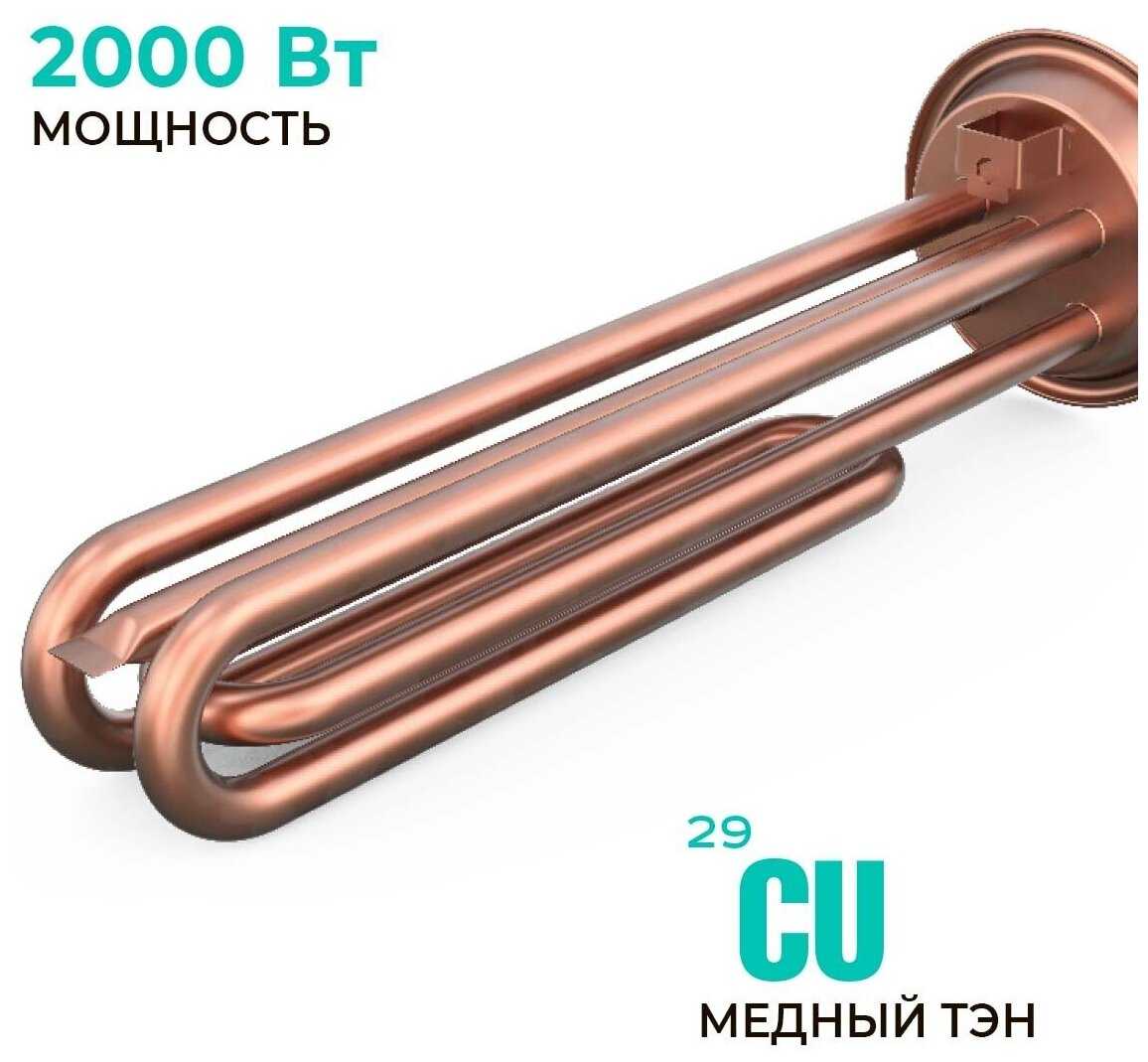 - Медный ТЭН мощностью 2 кВт (с возможностью ступенчатого включения 800/1200 Вт) разогревает полный бак до 75°C за 20-45 минут.