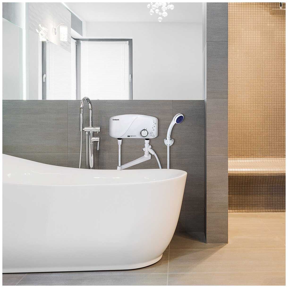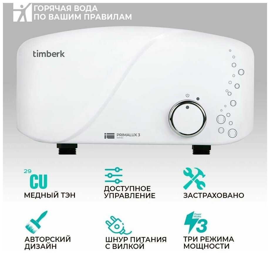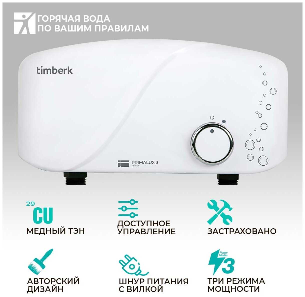 имею опыт использования проточного нагревателя фирмы POLARIS на 3,5 КВт. там нагрев воды идет при ее прохождении через медную трубку, при этом нагрев моментальный (5 секунд) и при достаточном напоре очень хорошая температура. Взял себе домой этот TIMBERT 5,5 КВт считая что он будет еще лучше. не тут то было - при минимальном потоке температура еле теплая. нагрев идет через эмкостную колбу путем подмешивания холодной воды к уже нагретой. после запуска нагрев воды идет в течение минуты и температура выходящего потока очень инертна после изменения входящего напора - температура устаканивается в течение 10-15 секунд. уступает первому абсолютно во всем. разочарован. посмотрим сколько он проработает и как будет вести себя с квартирной проводкой и автоматом.