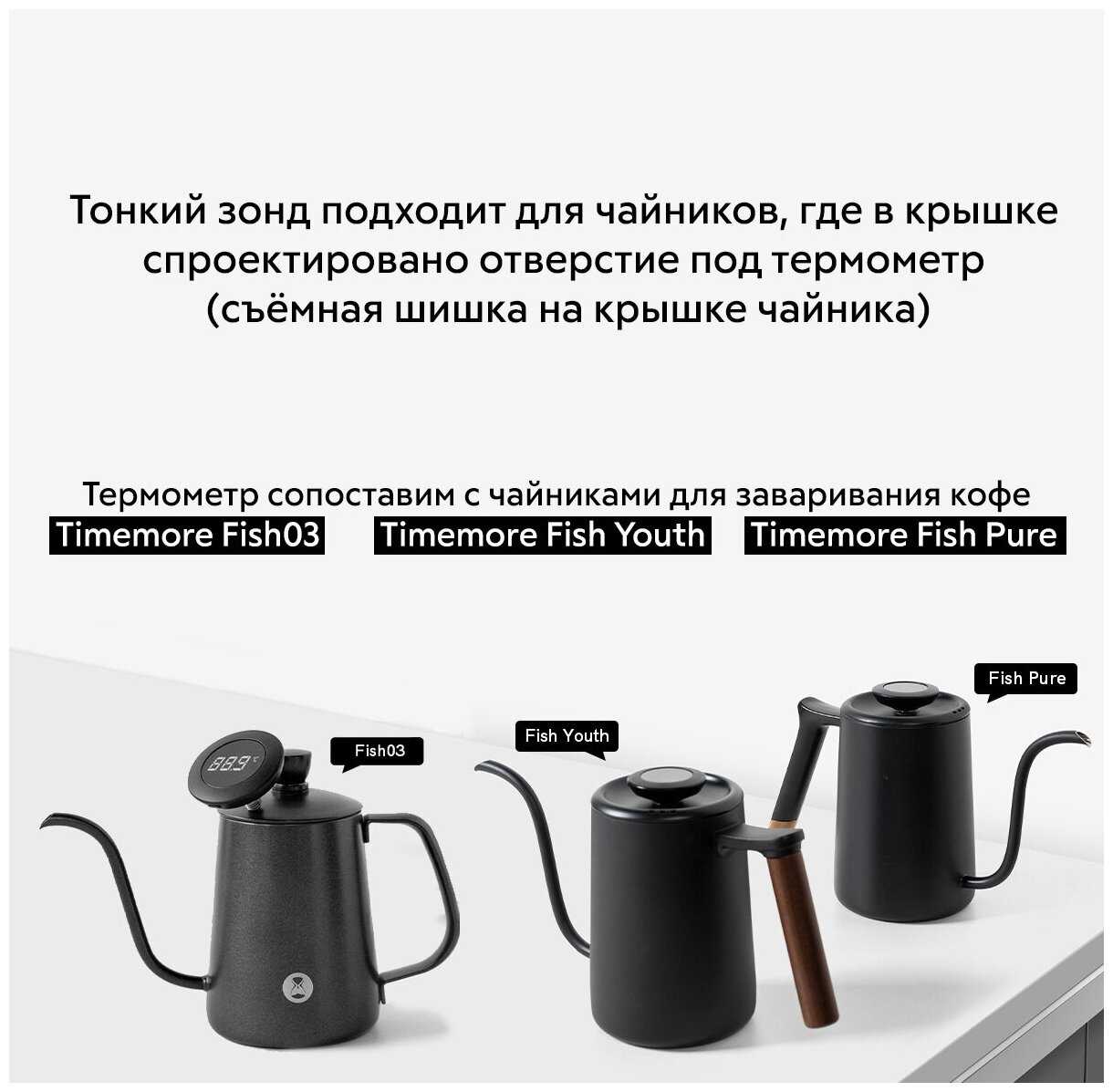 Приобрела вместе с чайником одноименной фирмы. Очень классная идея заменить ручку на крышке для более точного процесса заваривания кофе. Измеряет в секунду, такой цифровой, в отличие от подобных со шкалой, дает возможность более точно и быстро определить температуру. Сравнила с имеющимся дешевым (тот очень долго набирает градусы), показатели примерно равны, так что можно быть уверенным в хорошей точности Тайммо. Табло гаснет через некоторое время, но это не особо мешает, кнопка удобная. Сделан добротно, будет хорошим подарком. Все доехало целое, упаковка не помята.