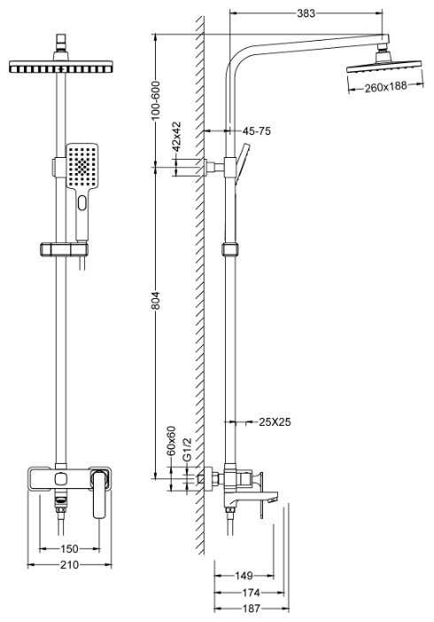 | Комплектация : | верхний душ, держатель лейки, душевая стойка, душевая штанга, излив для набора воды, кронштейн для верхнего душа, лейка, переключатель потоков, ручной душ, смеситель, шланг, эксцентрик |