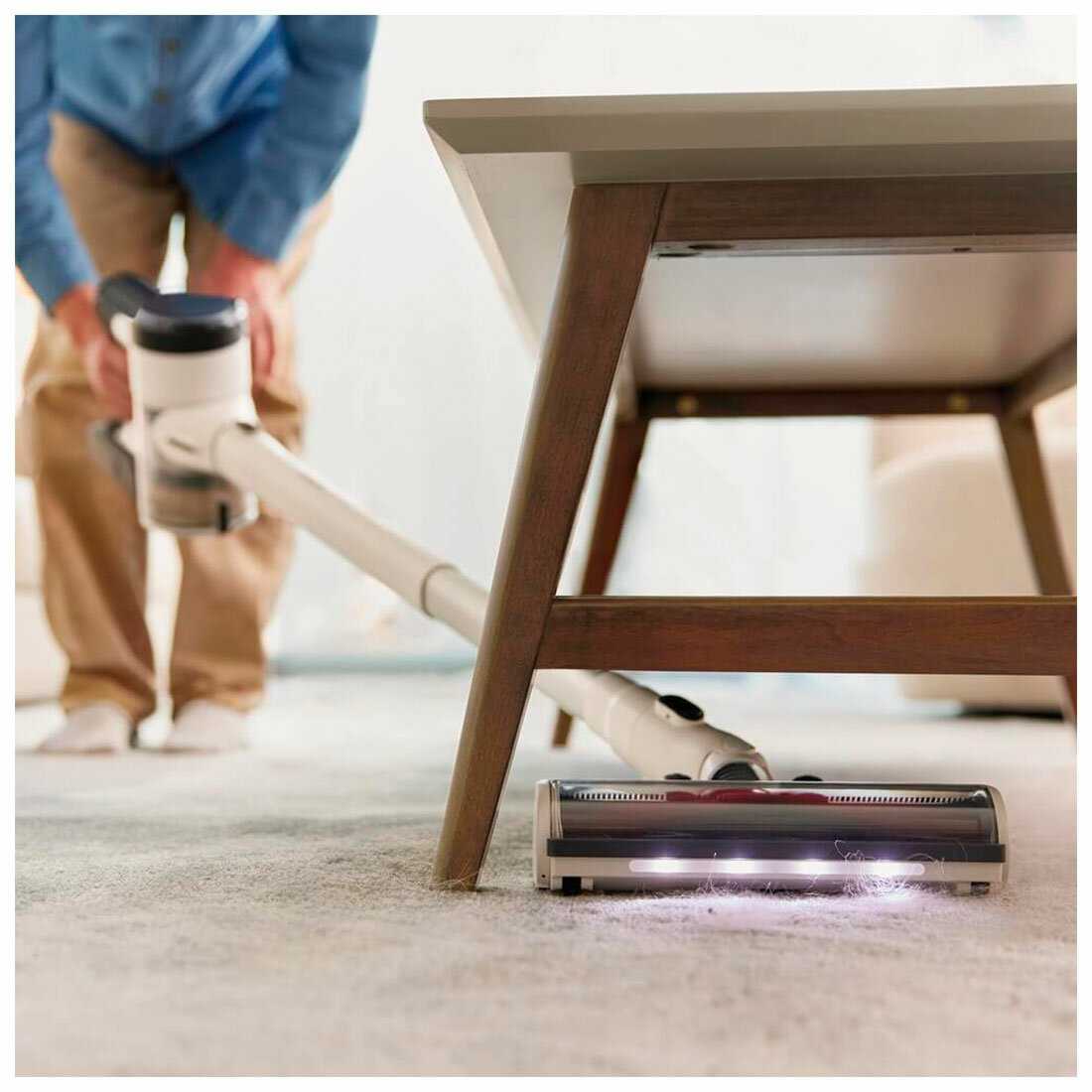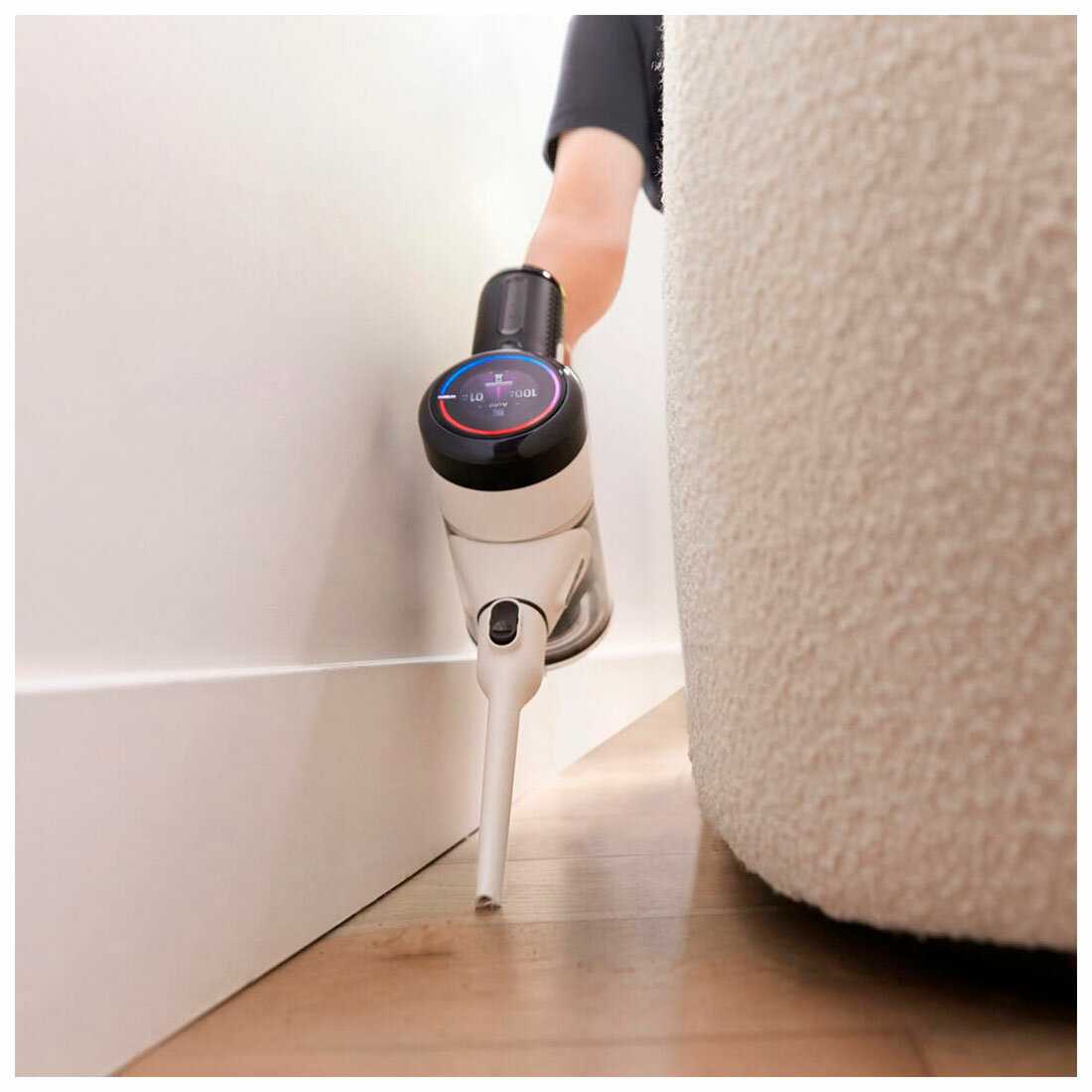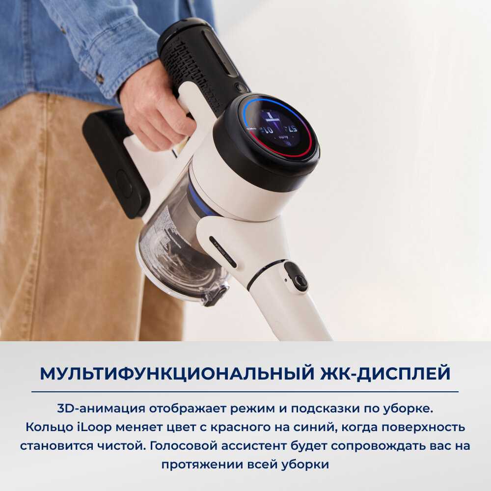 - + Пока всё нравится. Не супертяжёлый по весу, но ощущается как гантелька 2-3 кг. Футуристический дизайн, напольная (!) станция, три режима (авто, турбо и ручной), причём ручной управляется с помощью сенсорного плавного проведения пальца по дисплею и позволяет плавно менять мощность. Хорошая мощность всасывания и относительно всех других моделей и фирм недолгая зарядка (3 ч). Приложение загрузилось без проблем, но пока из нужного помогает только регулировать уровень звука голосового помощника пылесоса, а также помогли подсказки насчёт использования в виде картинок и видео. Так как это вообще мой первый подобный вертикальный пылесос, то хочется ещё отметить удобство подсветки у насадки, которая в тёмных местах реально помогает заметить грязь. А также очень удобный поворотный механизм крепления насадок, манёвренный.