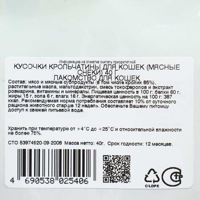 Дозировка : | Количество лакомств не должно превышать 10–15% от суточной потребности кошки в калориях. |