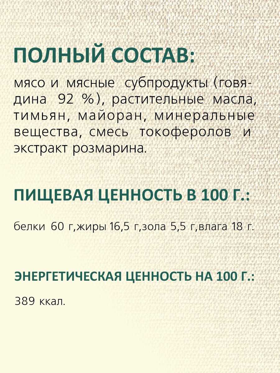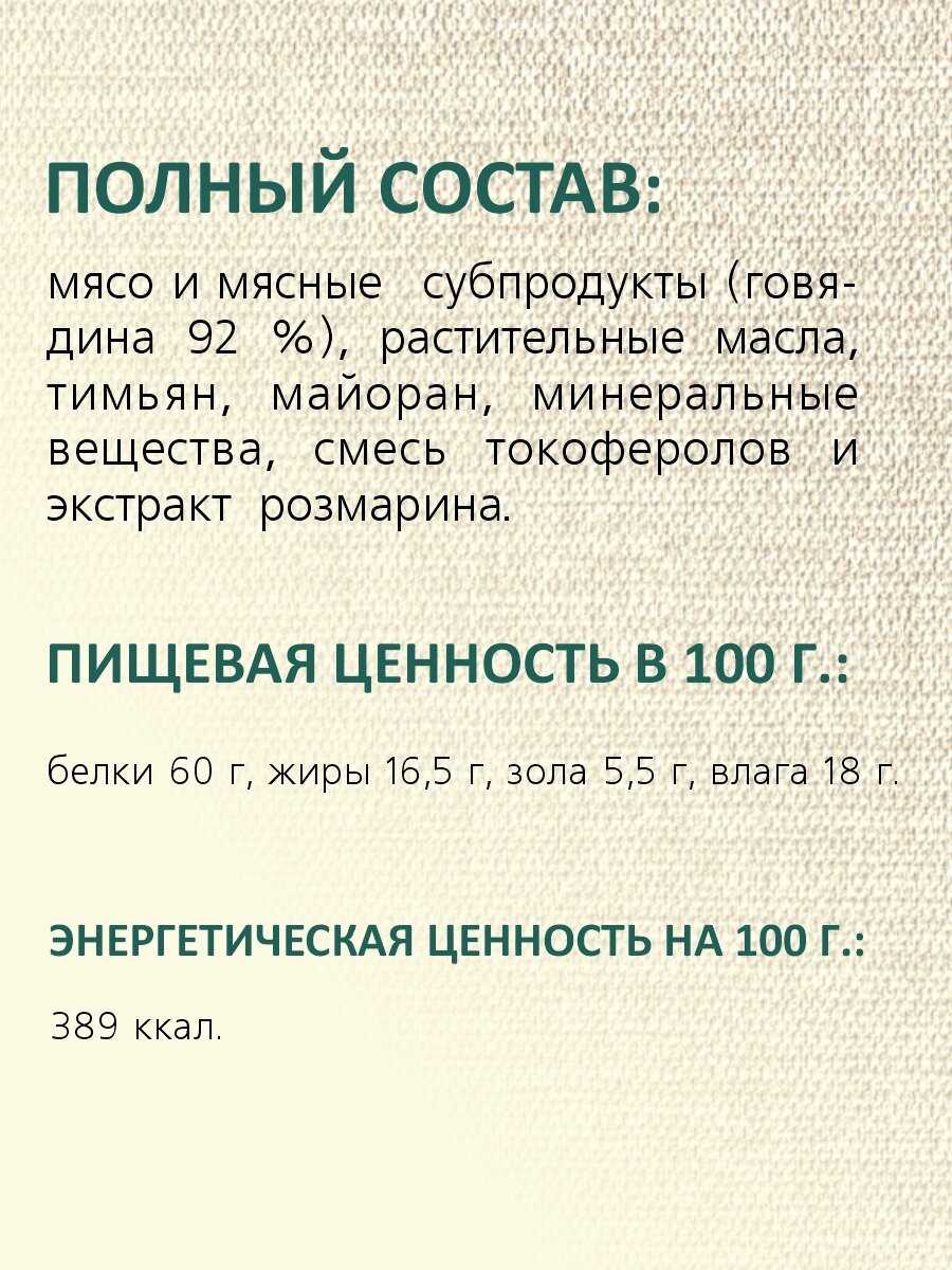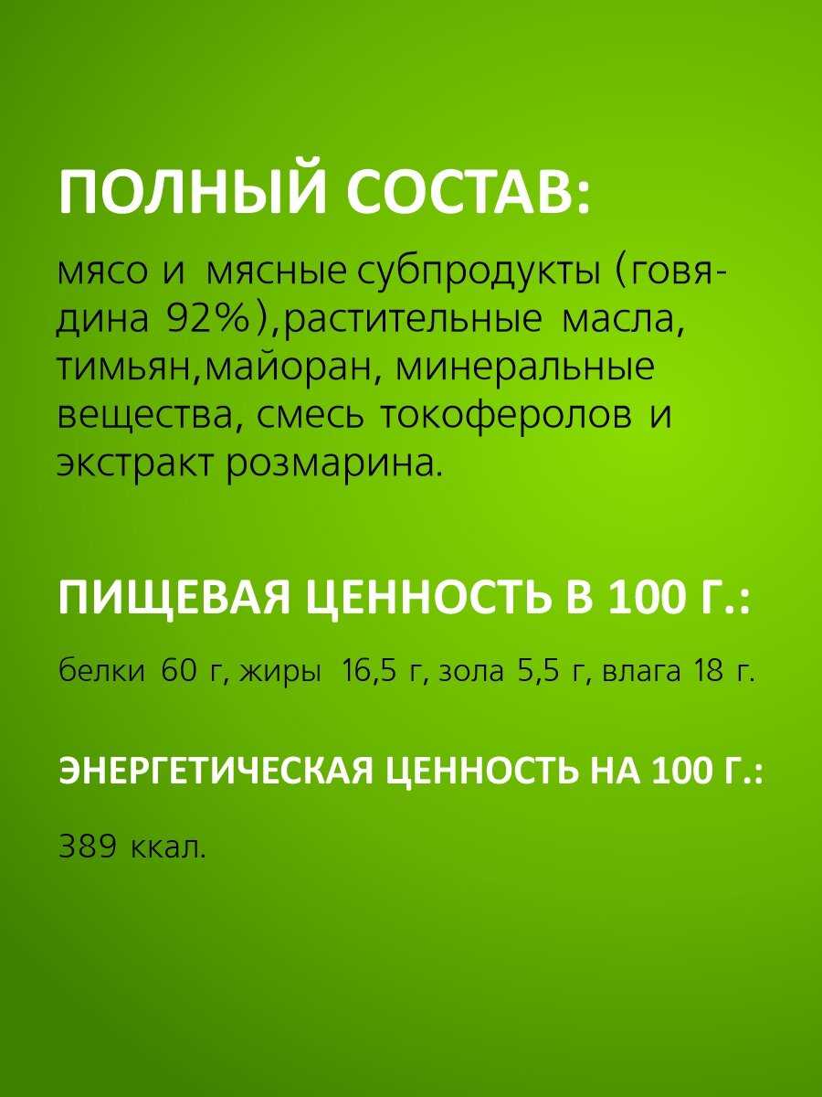 Состав : | мясо и мясные субпродукты (говядина 92%), растительные масла, альбумин черный, минеральные вещества, смесь токоферолов и экстракт розмарина. |