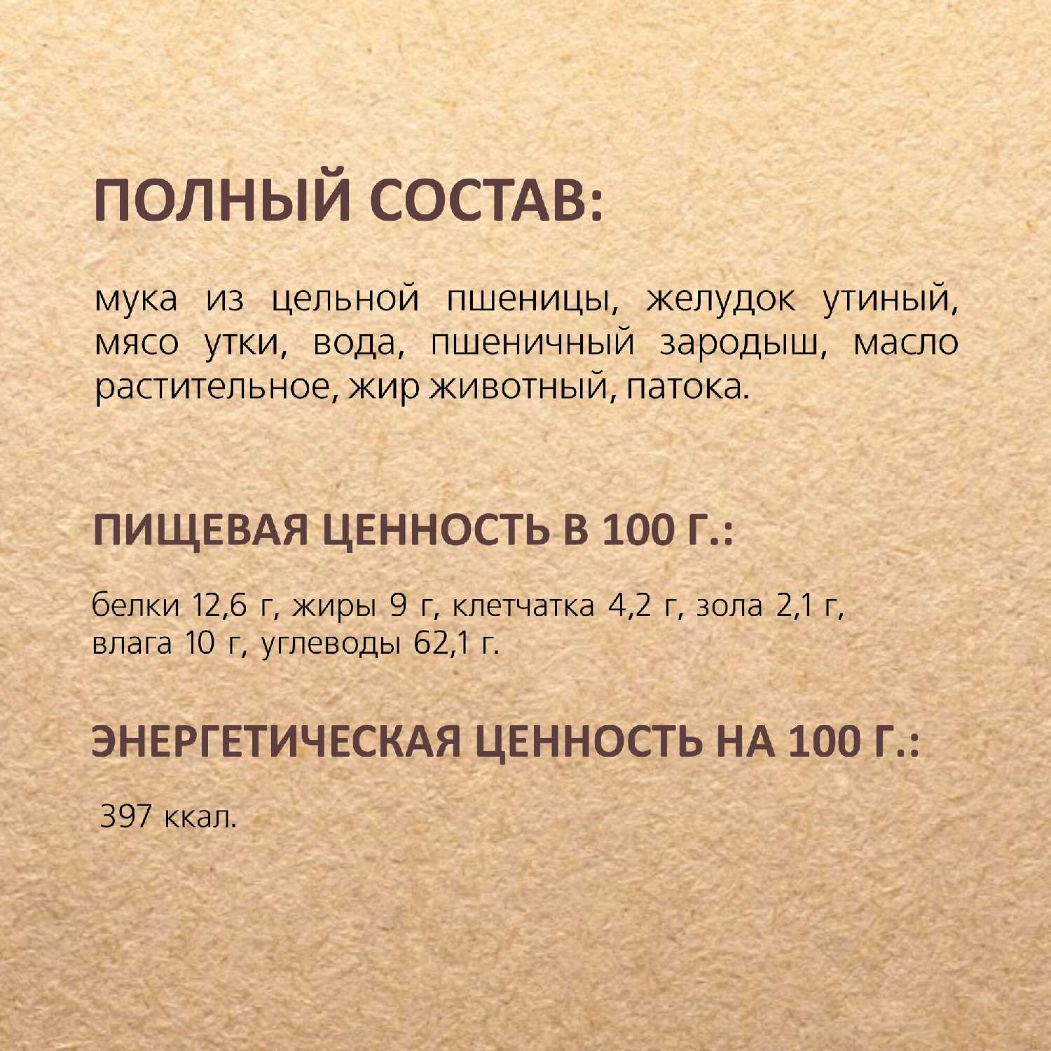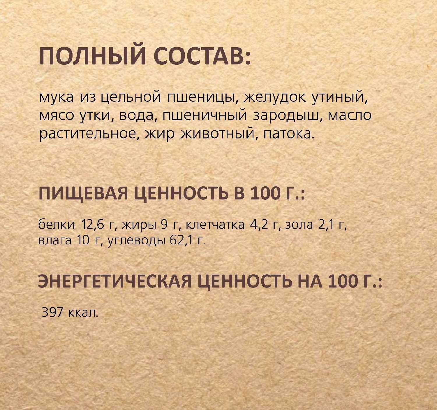 Состав : | Мука из цельной пшеницы, желудок утиный, мясо утки, вода, пшеничный зародыш, масло растительное, жир животный, патока. |