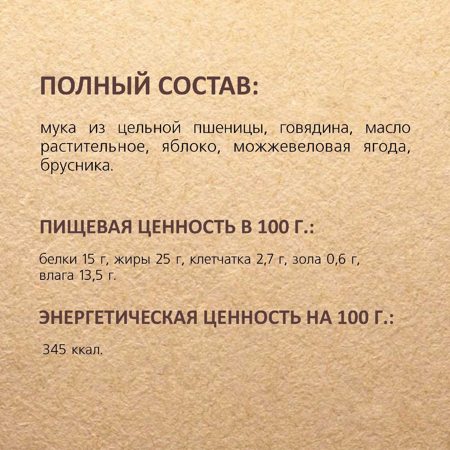 Состав : | мука из цельной пшеницы 63 % говядина 15 % масло растительное 7 % яблоко 5 % можжевеловая ягода 5 % брусника 5 %, пищевая ценность в 100 г: жиры 25 г белки 15 г влага 135 г клетчатка 27 г зола 06 г. |