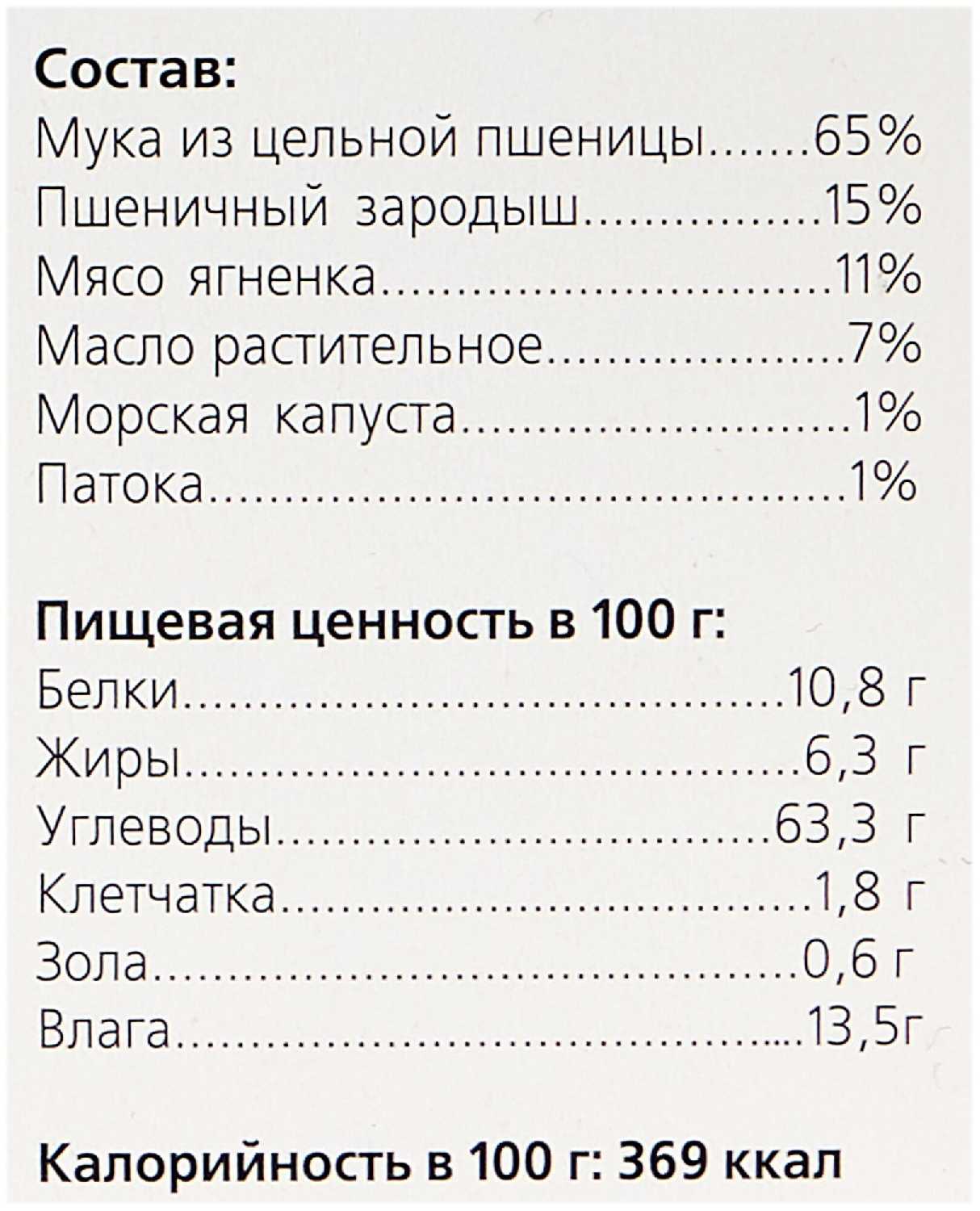 Состав : | мука из цельной пшеницы 65%, пшеничный зародыш 15%, мясо ягненка 11%, масло растительное 7%, морская капуста 1%, патока 1% |
