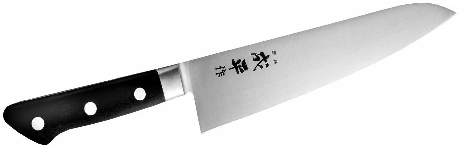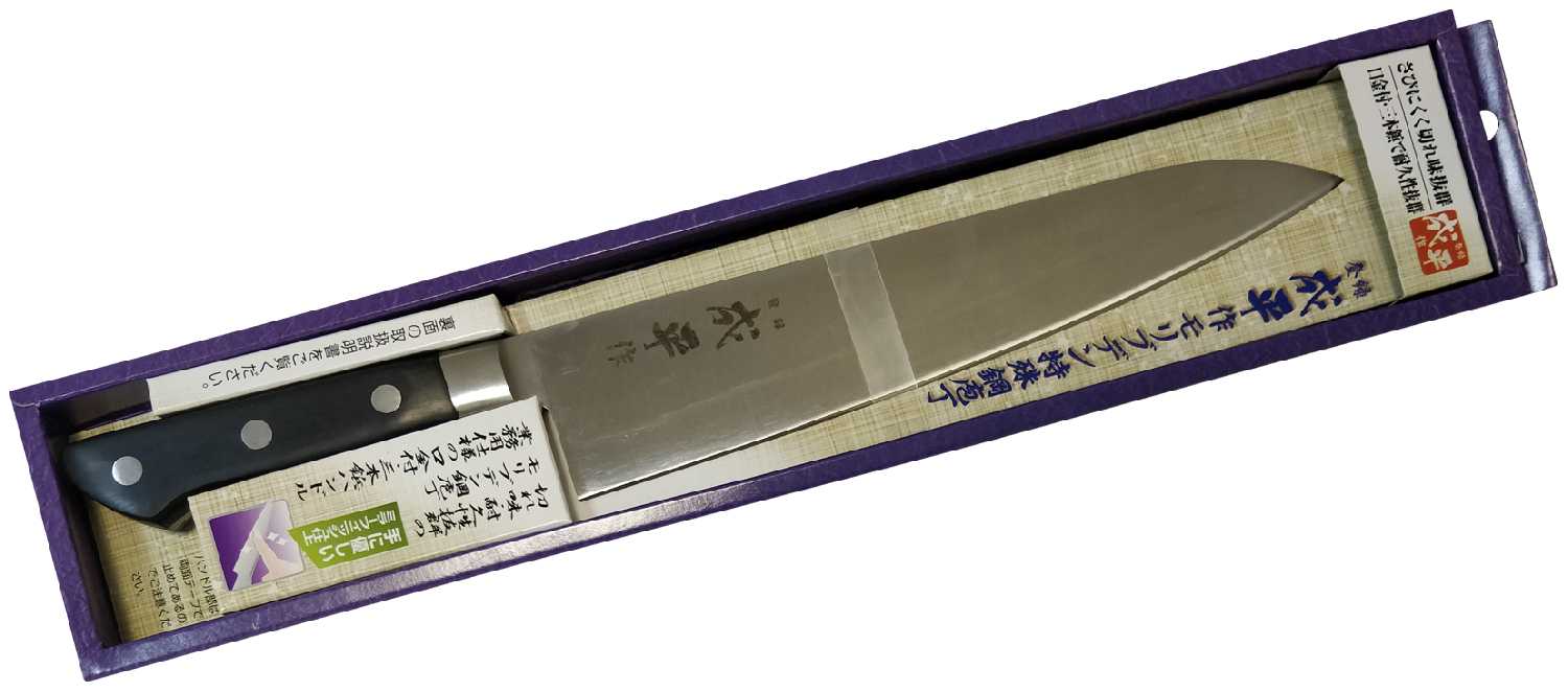 Этот нож двоякий, с одной стороны боллванка для него делается в Китае, в Японии его собирают шлифуют и точат, кривая кромка, ручка с выступами, но с другой,,, а что с другой, идеальная геометрия кухонного ножа, длина 240,щирина +-50 мм, делают его просто идеальным шефом, говорю как профессиональный повар, который обрабатывает килограммами продукты, заточку держит для нержавейки обычно, правлю мусатом на постоянной основе, из за так себе обработки портится впечатление и зная что произведён на половину в Японии, а так очень хороший нож за свои деньги.