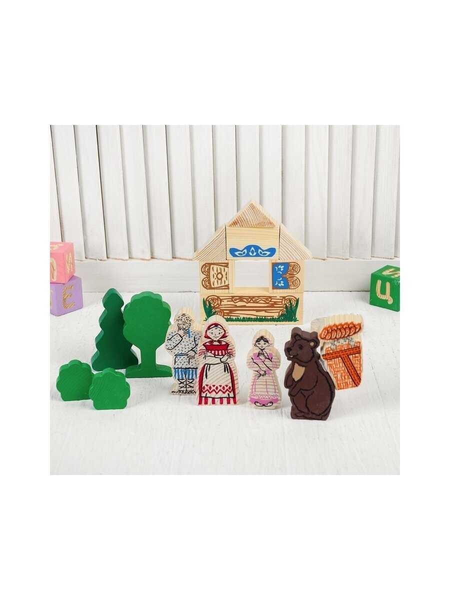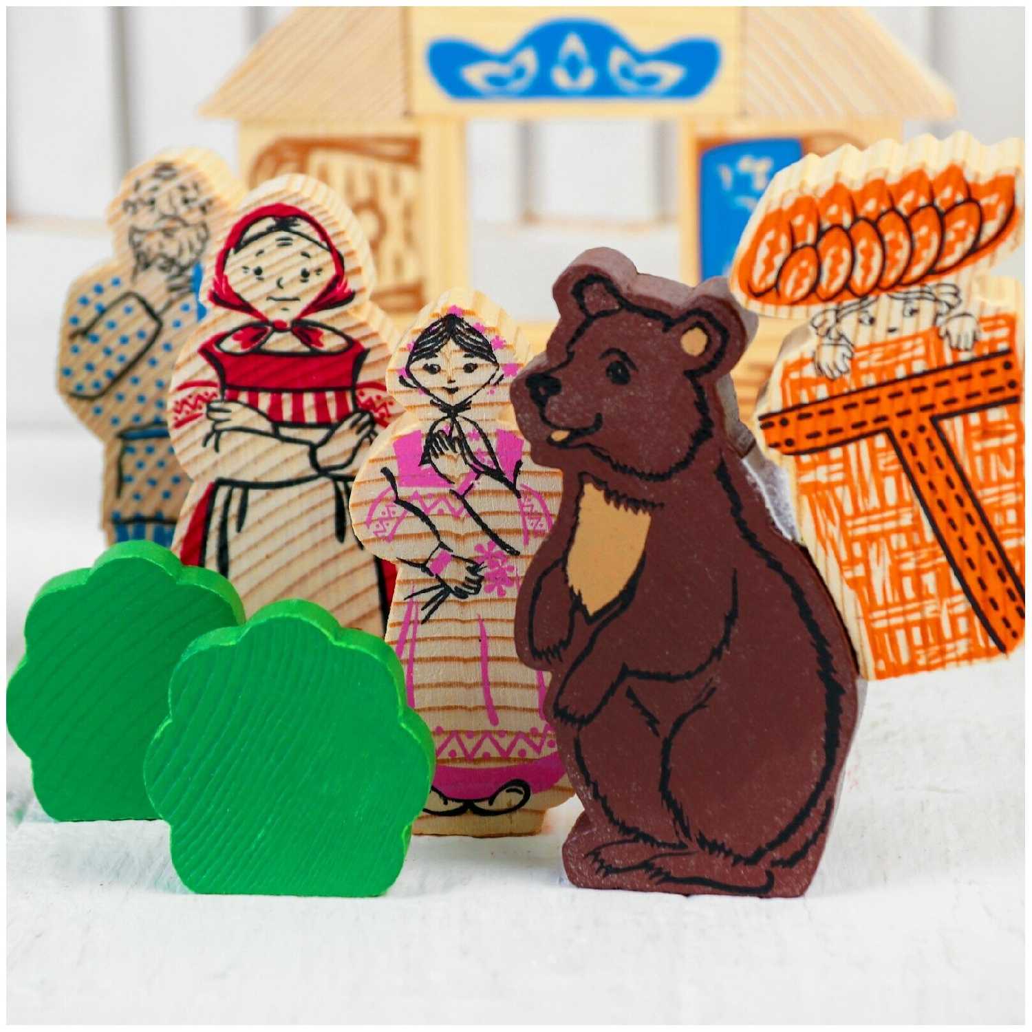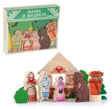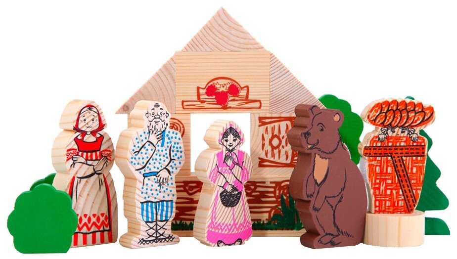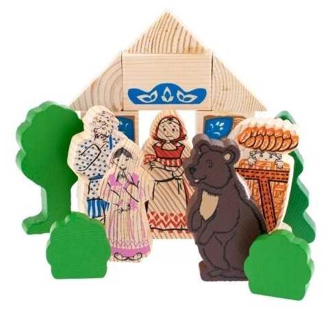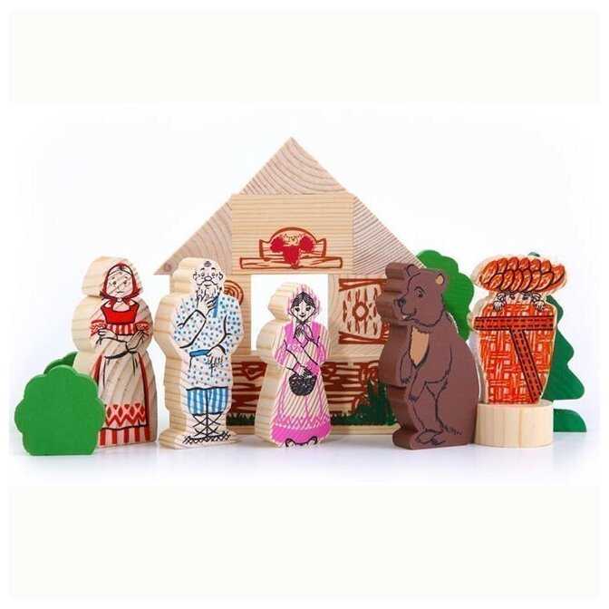 Комплектация : | Фигурки деда бабы внучки Маши медведя, 2 дерева 2 куста и даже пенек, Короб с пирожками, 7 составных элементов домика, Текст народной сказки |