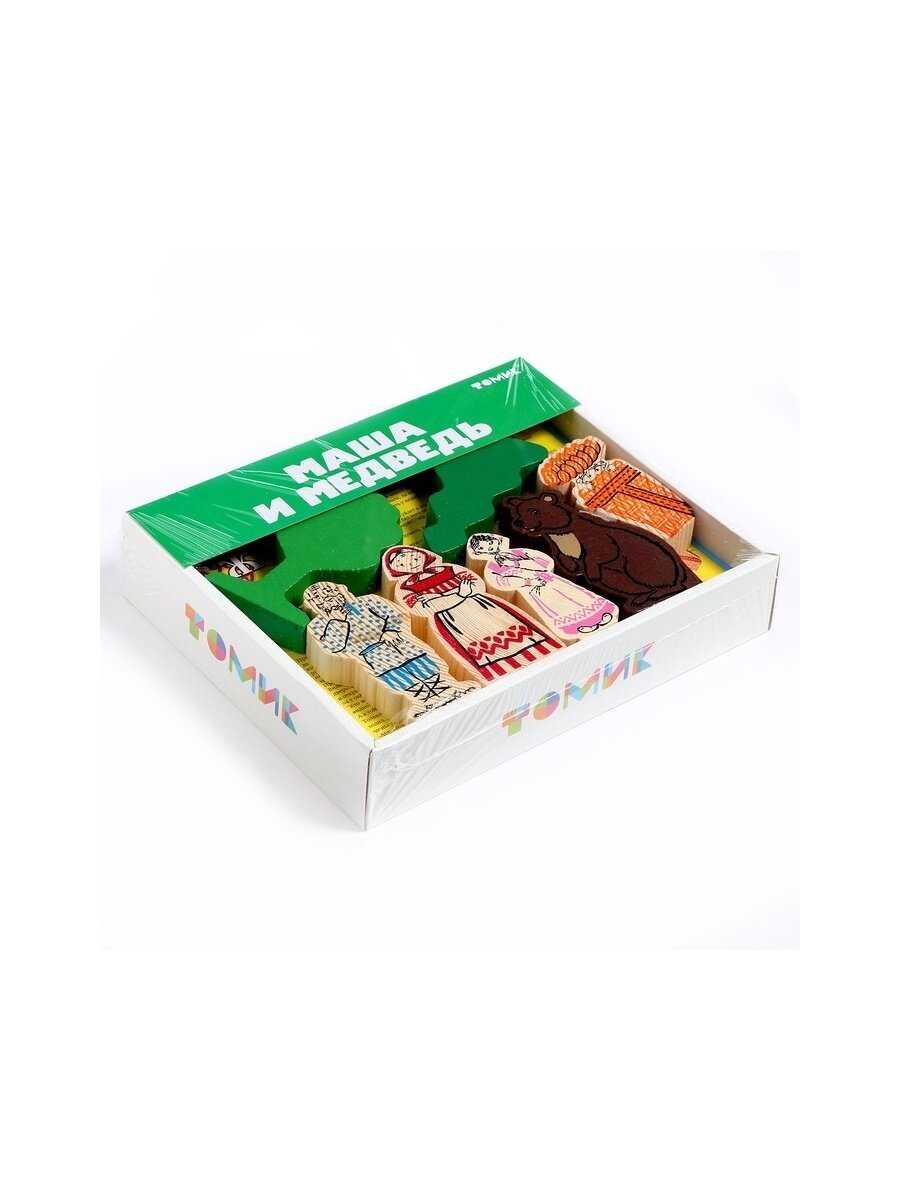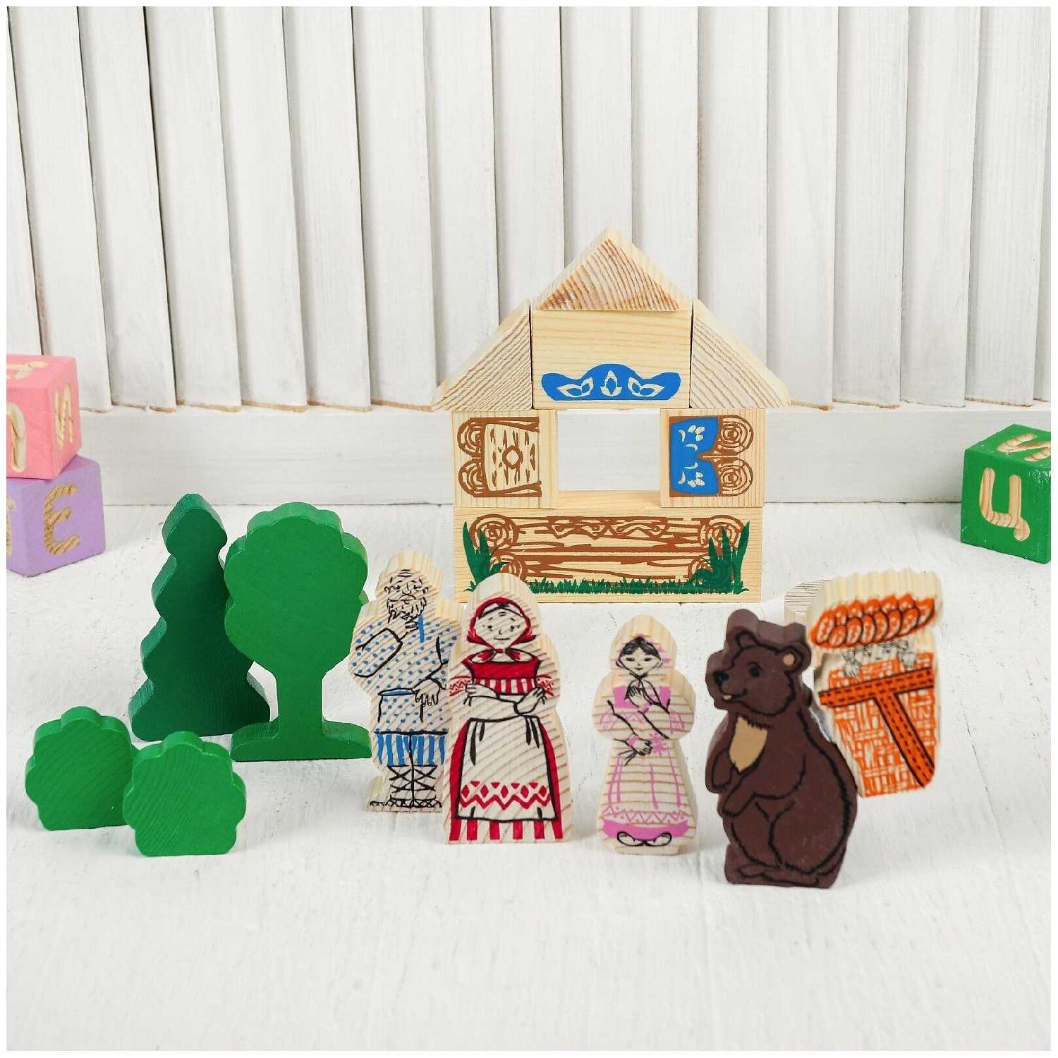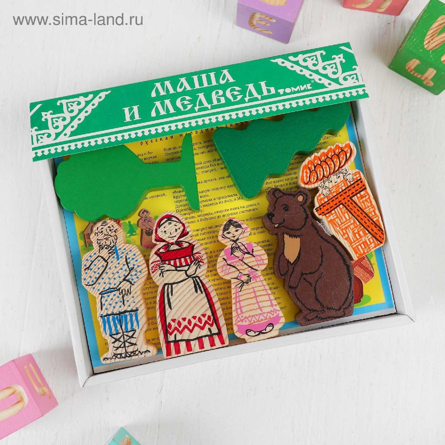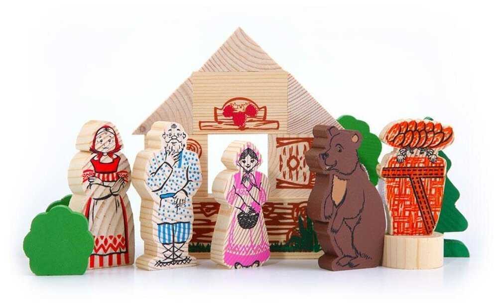 Комплектация : | Фигурки деда бабы внучки Маши медведя, 2 дерева 2 куста и даже пенек, Короб с пирожками, 7 составных элементов домика, Текст народной сказки |