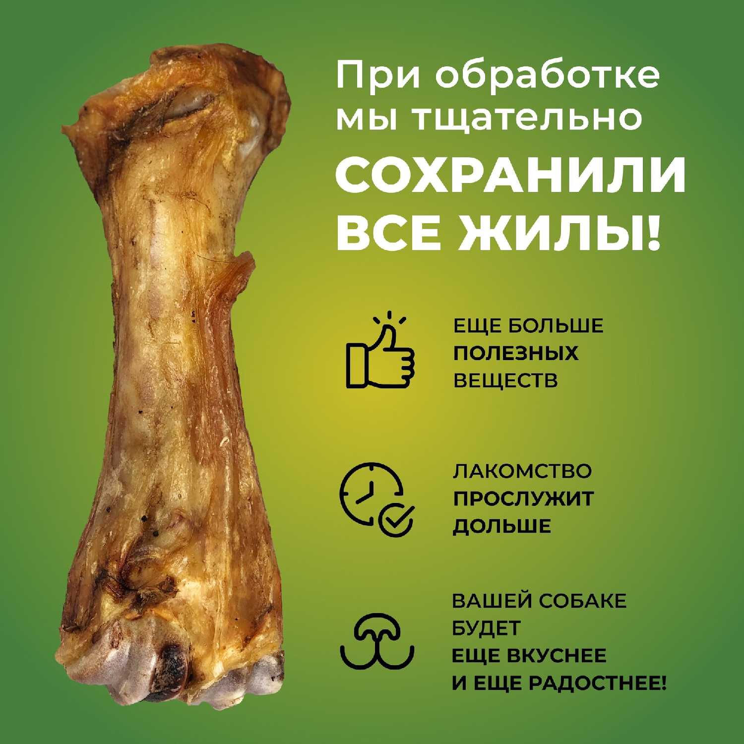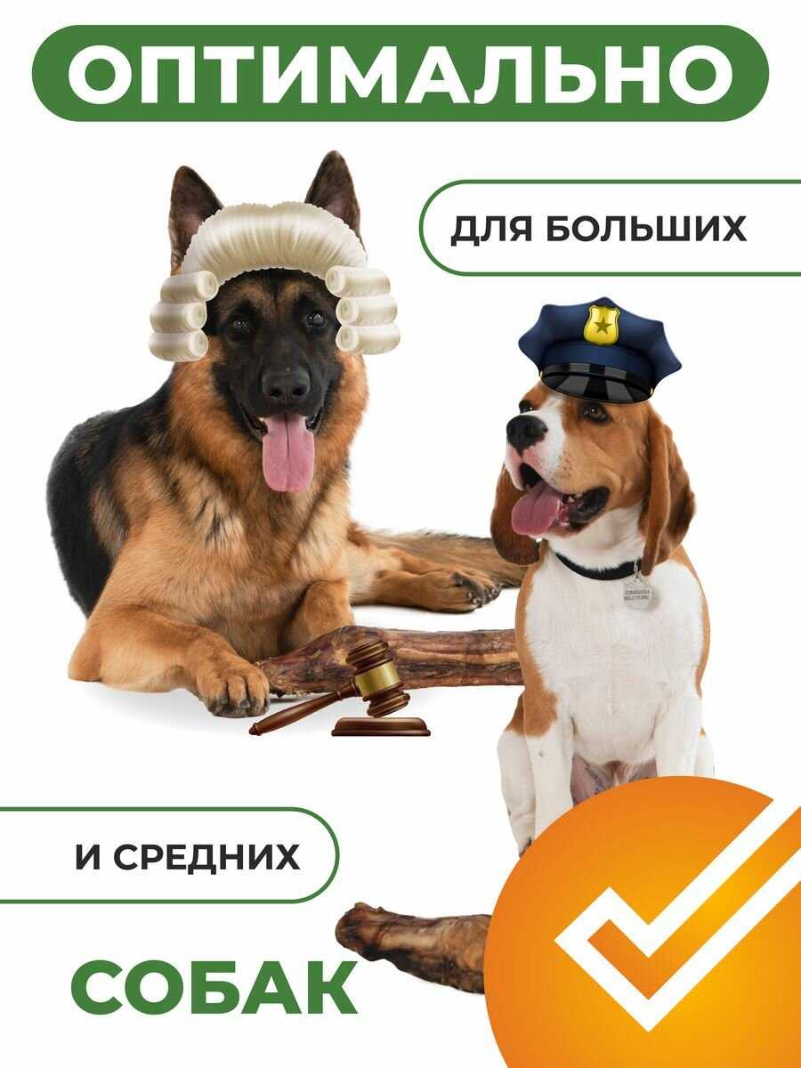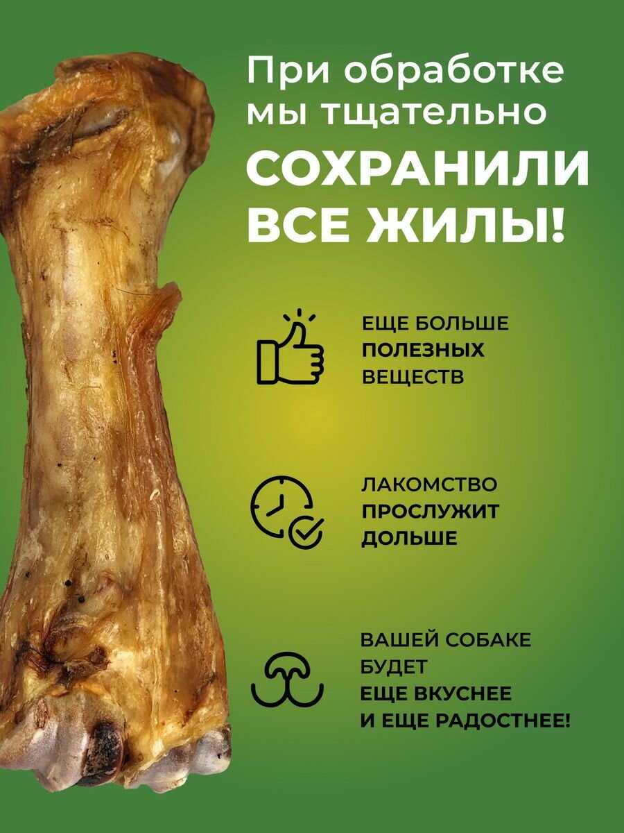 Кость имеет большой размер (подходит для собак от 25 кг) и вес, обеспечивая долговечность при жевании. Наличие хрящей и сухожилий создаёт абразивную поверхность для чистки зубов, а натуральный жир усиливает вкусовую привлекательность. Однако крупные габариты могут затруднять хранение. -
