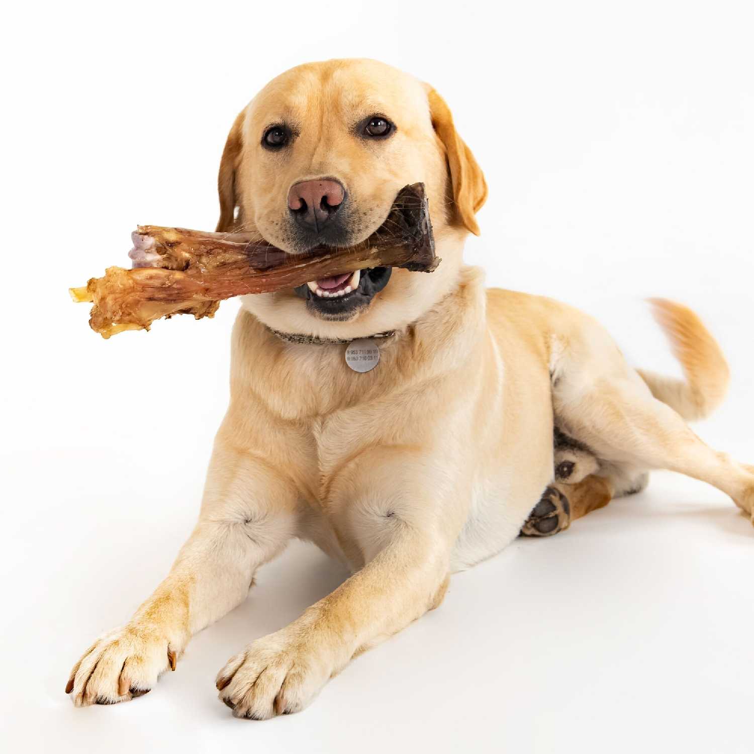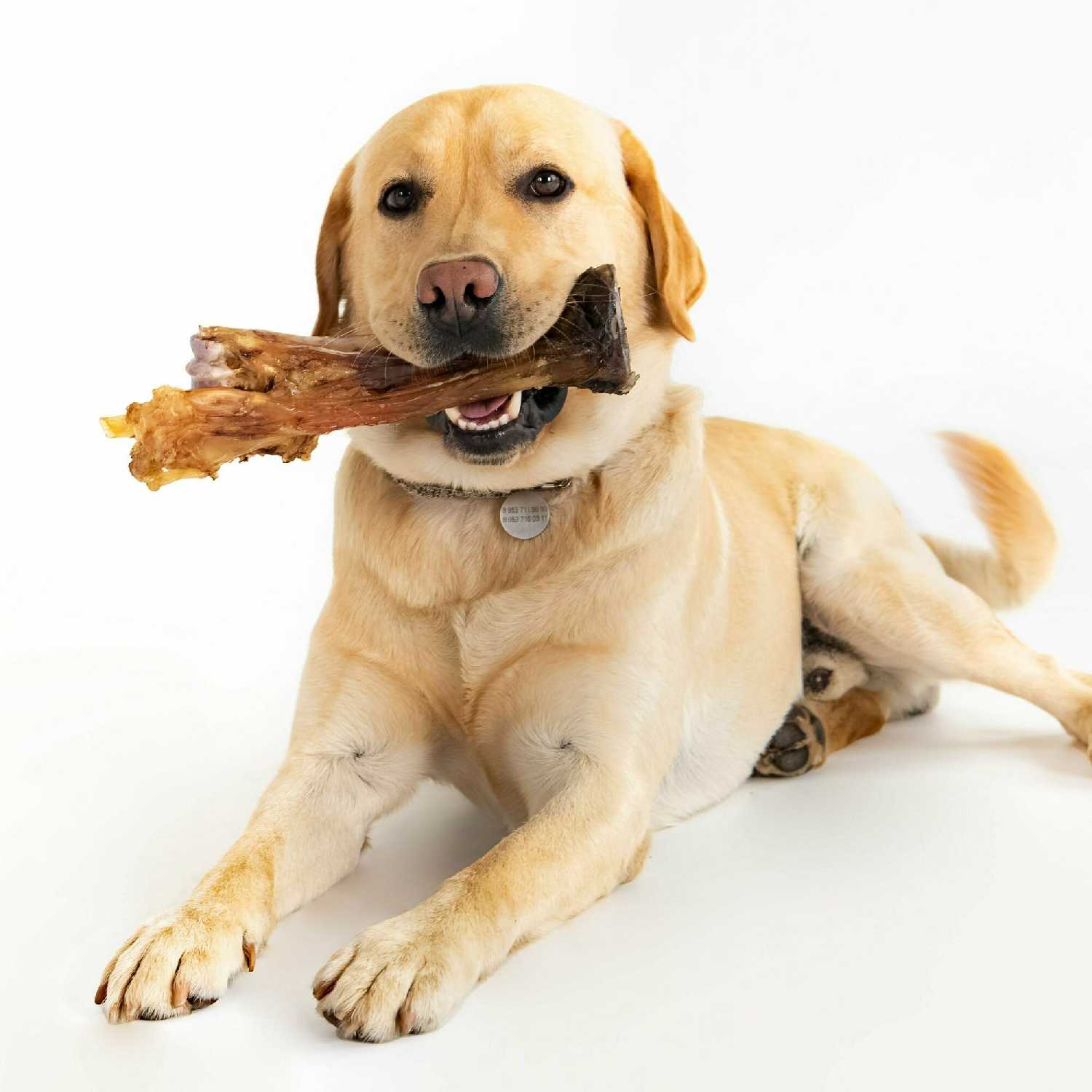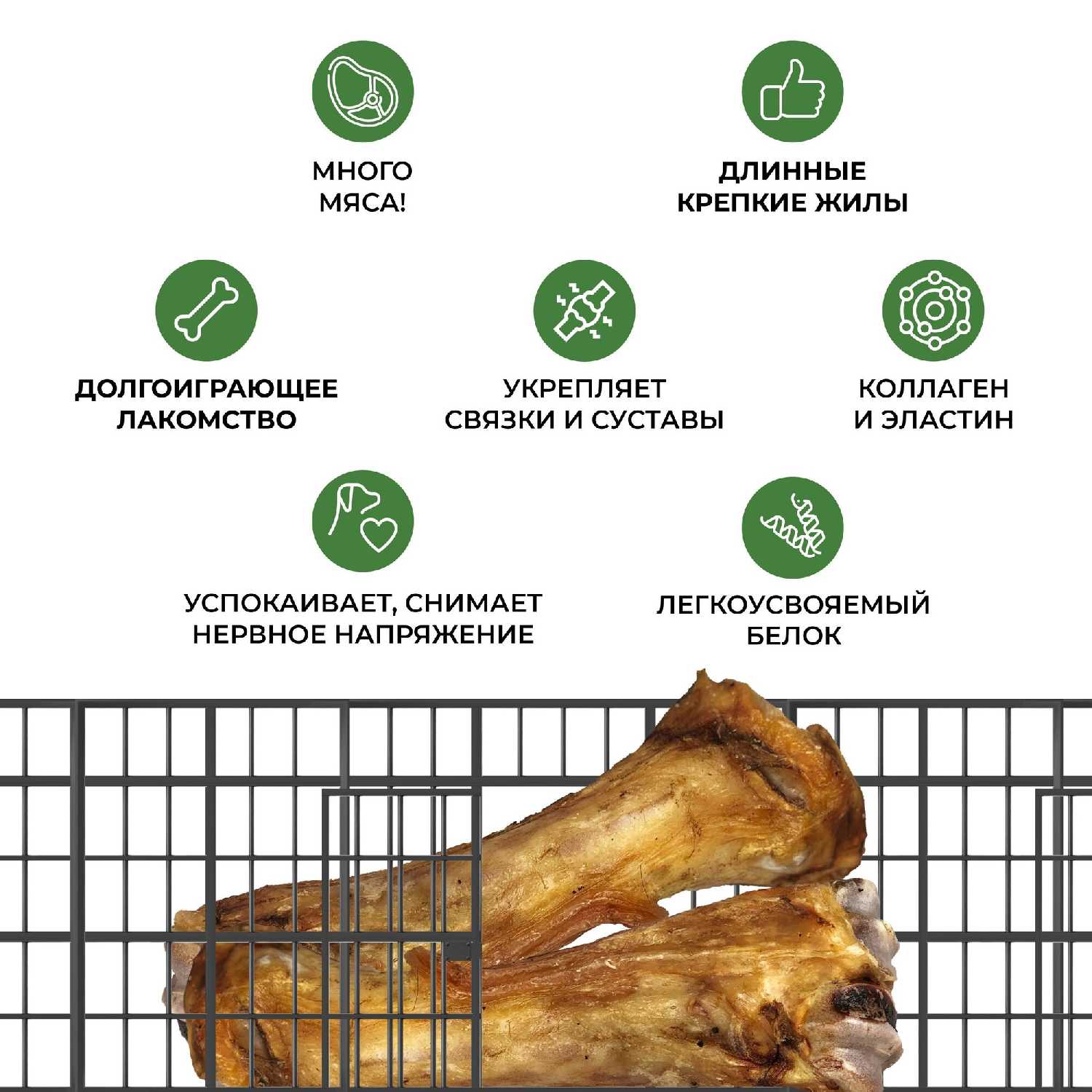 Кость имеет большой размер (подходит для собак от 25 кг) и вес, обеспечивая долговечность при жевании. Наличие хрящей и сухожилий создаёт абразивную поверхность для чистки зубов, а натуральный жир усиливает вкусовую привлекательность. Однако крупные габариты могут затруднять хранение. -