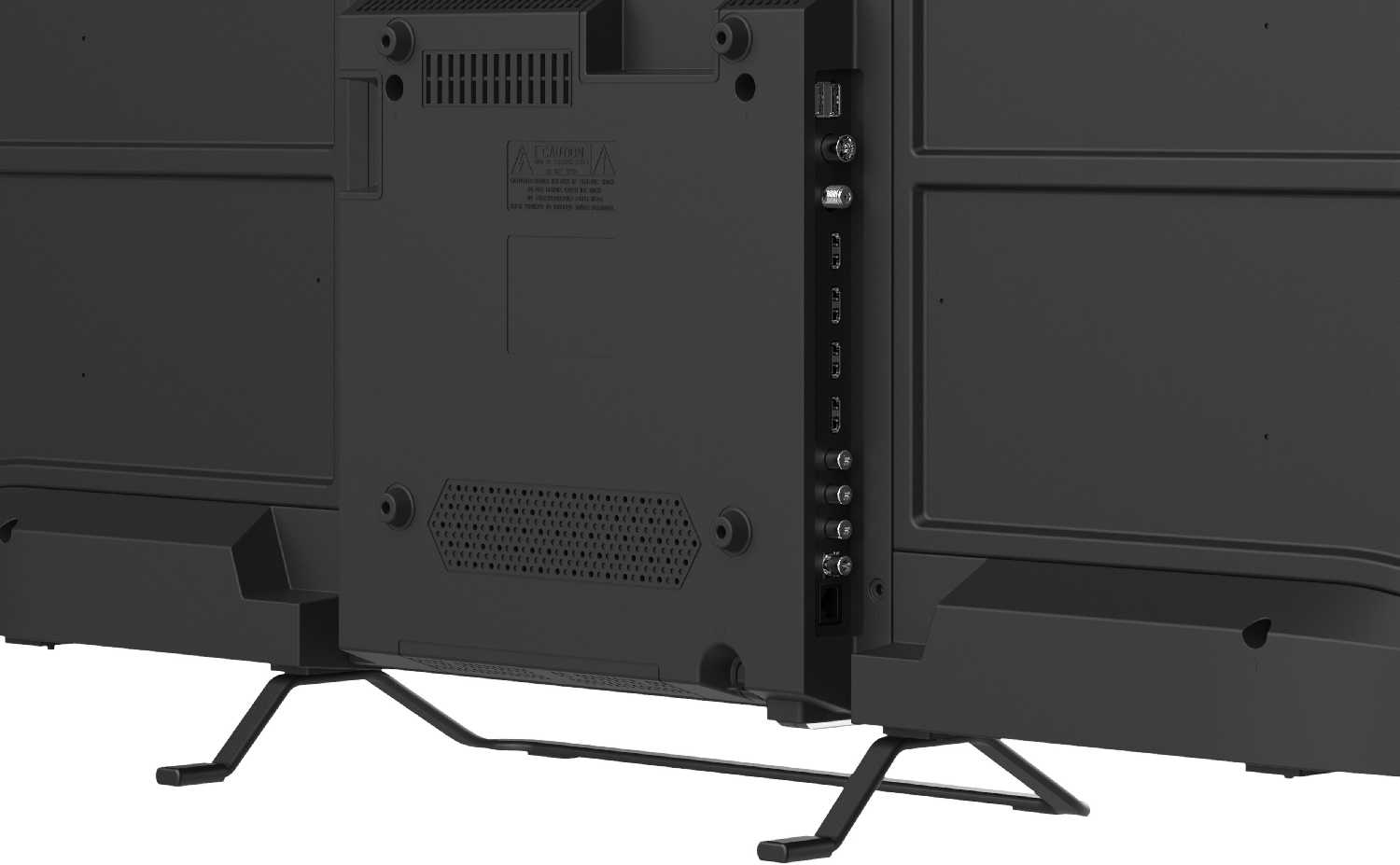 Телевизор выделяется качественной сборкой в металлическом тонком корпусе (рамка ~8 мм) и надёжной центральной подставкой. Поддержка VESA 200x200 упрощает настенный монтаж. Три порта HDMI удобны для подключения мультимедийных устройств, но USB-разъёмы работают нестабильно: флешки распознаются при подключении, но затем "исчезают" из меню. Отмечается лёгкий вес и компактность, позволяющая размещать технику близко к стене. На корпусе всего одна кнопка управления, что усложняет ручное управление без пульта.