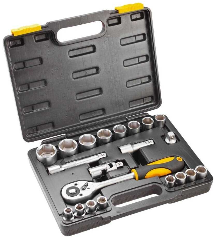 | Дополнительная информация : | Головки 1/2 16 шт.: 10 11 12 13 14 15 16 17 18 19 21 22 24 27 30 32 мм, Удлинитель 1/2 2 шт.: 75 мм и 125 мм, Трещотка 1/2, Универсальный шарнир 1/2, Вороток сквозной Т-образный 1/2, Чемодан |