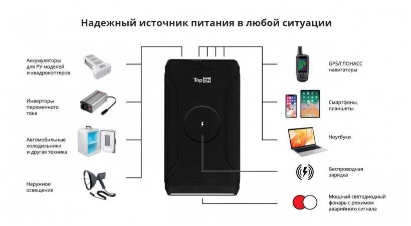 Большая емкость, многофункциональный, беспроводная зарядка, фонарик. DC разъём что позволяет заряжать ноутбук, или другие устройства. Заряда полного будет хватать на долго.