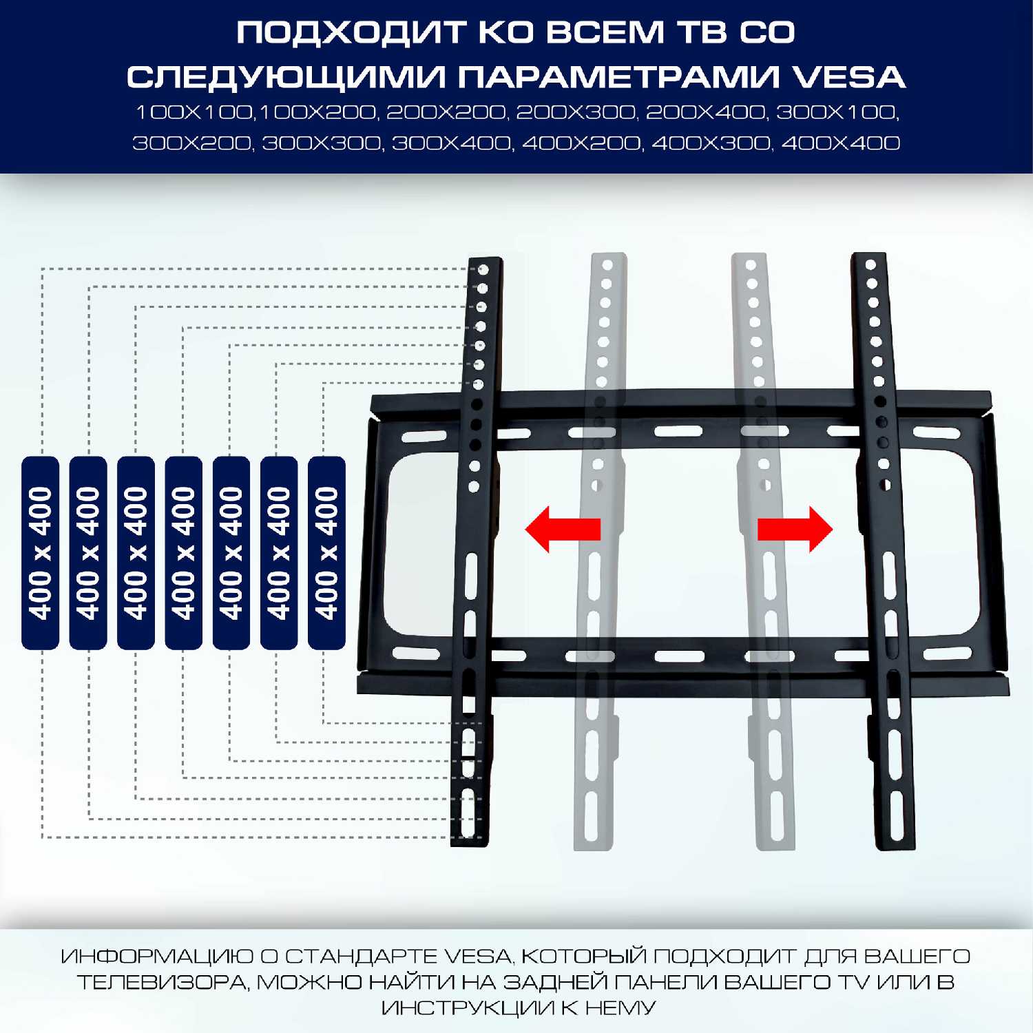 Стандарт Vesa : | 100x100 мм, 100х400 мм, 200x100 мм, 200x200 мм, 200x300 мм, 200x400 мм, 300x300 мм, 300x400 мм, 400x300 мм, 400x400 мм |