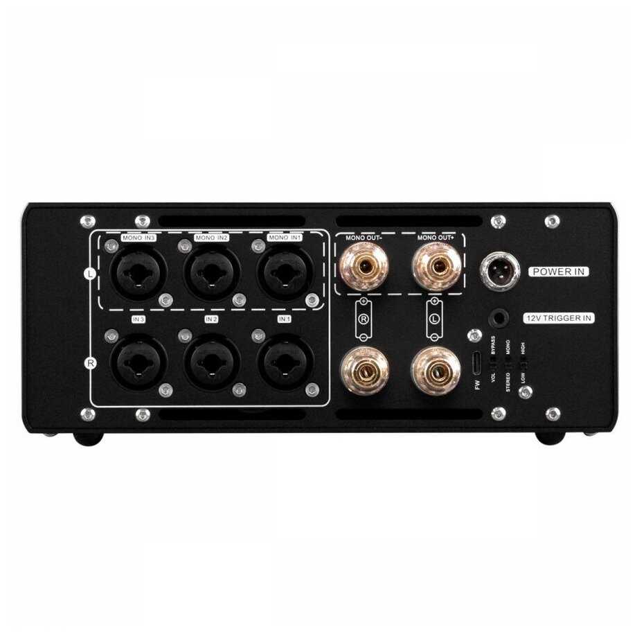 Предлагает два уровня регулируемого усиления. Первый, Low Gain, обеспечивает усиление +9, 4 дБ в стерео или +15, 4 дБ в моно, а второй, High Gain, обеспечивает усиление +19, 4 дБ в стерео или +25, 4 дБ в моно.