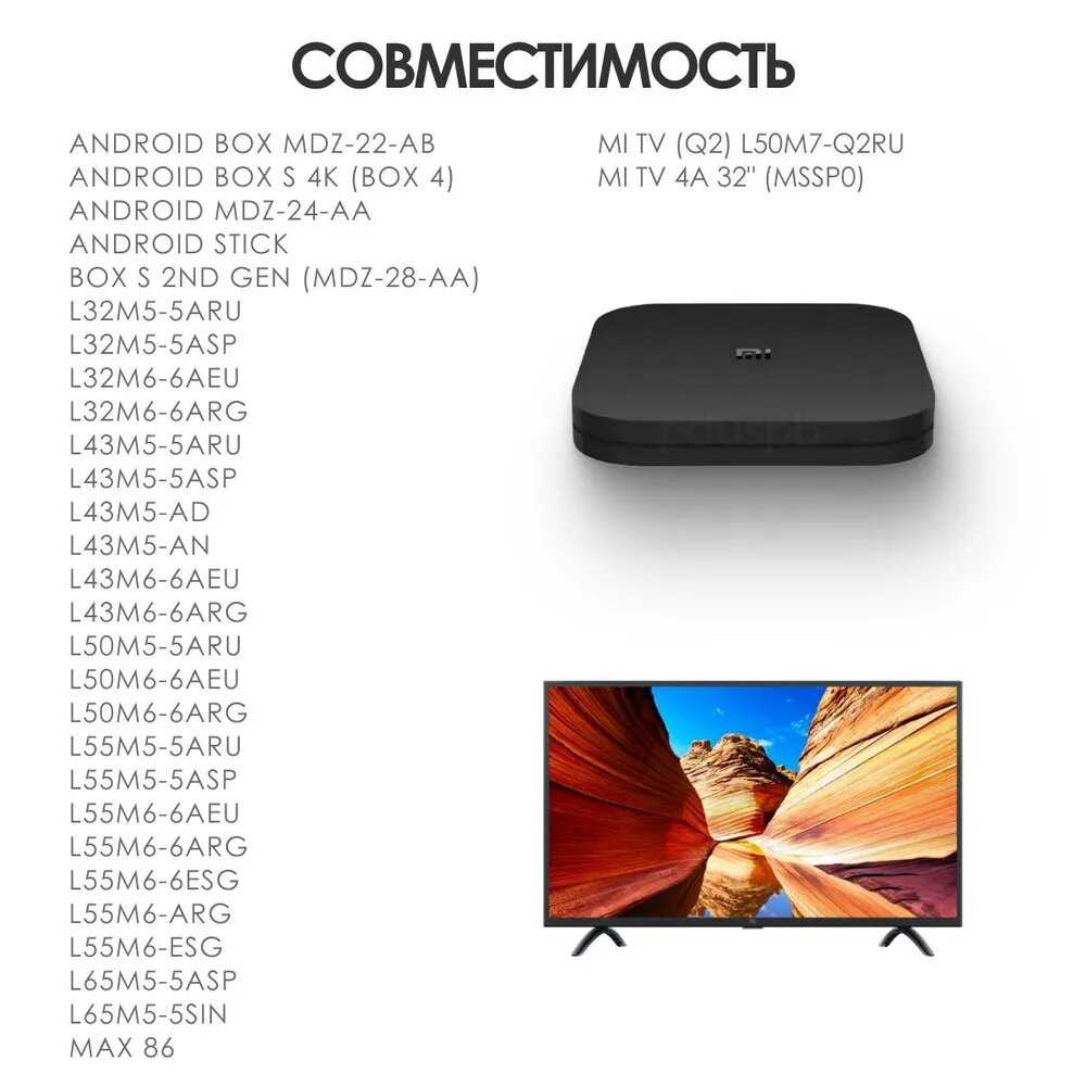 | Дополнительная информация : | Список поддерживаемого оборудования: Xiaomi MI TV P1 32 Xiaomi MI TV P1 50 Xiaomi Mi TV A2 Xiaomi Mi TV A2 32" Xiaomi Mi TV A2 43" 4K Xiaomi Mi TV A2 (L43M7-EARU) Xiaomi Mi TV A2 50" Xiaomi Mi TV A2 55" 4K HDR Xiaomi Mi TV Stick Xiaomi Mi TV Max 86 Xiaomi Mi TV Q1E 55 Xiaomi Mi TV Q2 50 Xiaomi Mi TV Q2 55 Xiaomi Mi TV Q2 65 Xiaomi L32M6-6ARG Xiaomi L43M6-6ARG Xiaomi L50M6-6ARG Xiaomi L55M6-ARG Xiaomi L55M6-ESG Xiaomi L55M6-6ESG Xiaomi L55M6-6ARG Xiaomi (Q2) L50M7-Q2RU Xiaomi MDZ-24-AA Xiaomi Mi TV Box S 2nd Gen (MDZ-28-AA) и многие другие (список может быть не полным). |