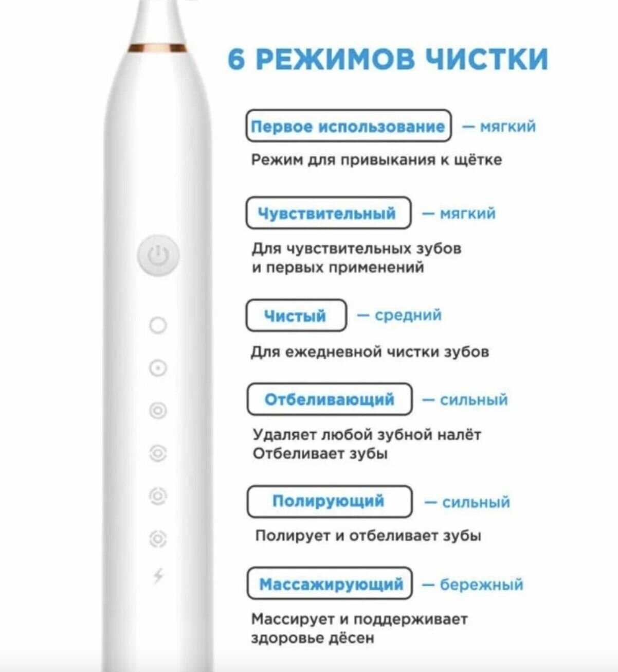 - + Зубные звуковые щетки становятся все более популярными благодаря своей эффективности и удобству использования. Что касаемо данной - она рабочая. Что несомненно радует за такую стоимость. Пользуясь звуковой щеткой, я заметила, как значительно улучшилось состояние моих десен и общее качество гигиены полости рта. Есть 6 режимов работы ( чувствительный, нежный, чистый, массаж, защита десен, отбеливание). Пользоваться легко, хотя инструкция на английском ( кратко- короткое нажатие, что бы вкл. так же коротким нажатием переключение режимов). В комплекте было зубная щетка, 4 насадки и зарядка. Думаю прослужил долго. Пока горит красным- низкий запад. Горит зелёным - полный заряд. Начинает мигать красным - садится зарядка. Если долго обрабатываешь одно место/ зуб или сильно нажимаешь отключается ( очень полезная функция)