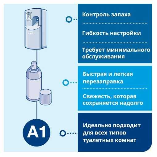 | Дополнительная информация : | работает только с освежителями tork, может обслуживать помещения площадью до 20 кв. м, звуковой индикатор наполнения аэрозоля и заряда батареи |