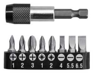 | Биты подробно : | В комплект входят 8 бит, включая PH1, PH2, PH3 (Phillips), PZ1, PZ2 (Pozidriv) и SL4, SL5.5, SL6.5 (шлицевые) |