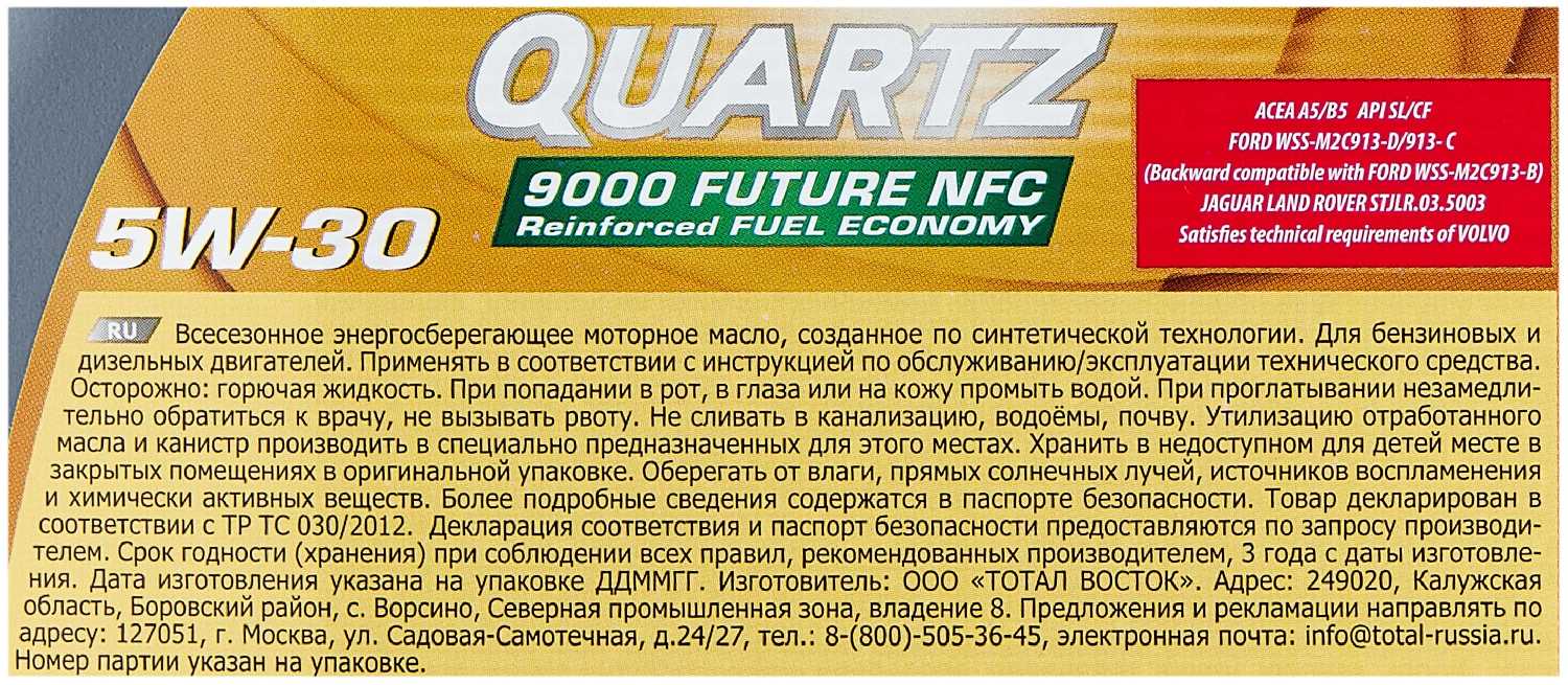Пользуюсь моторным маслом Total Quartz Future NFC 5W-30 в течении 5 лет. Цена соответствует качеству. Рекомендую к покупке.