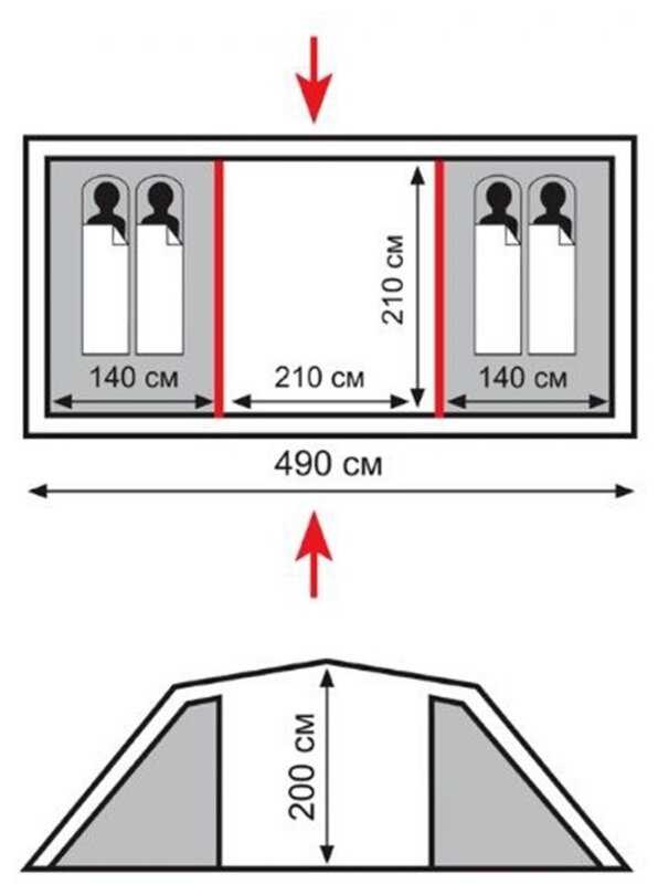 - + Большая палатка! 4 человека размещаются свободно. Два отделения - две комнаты. Как раз для родителей и для детей. Собирается быстро и несложно. Оказалась устойчива к сильным порывам ветра и дождю. Здорово, что внутри внутреннего тамбура можно спокойно стоять.