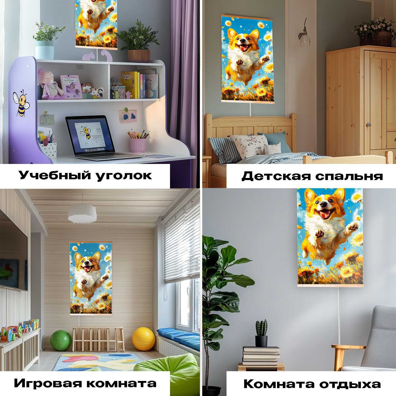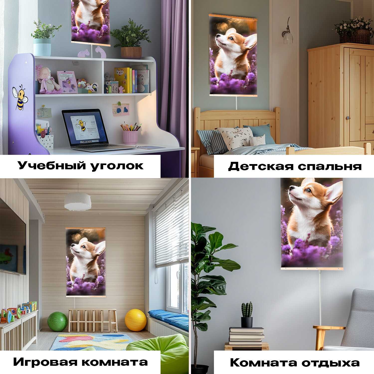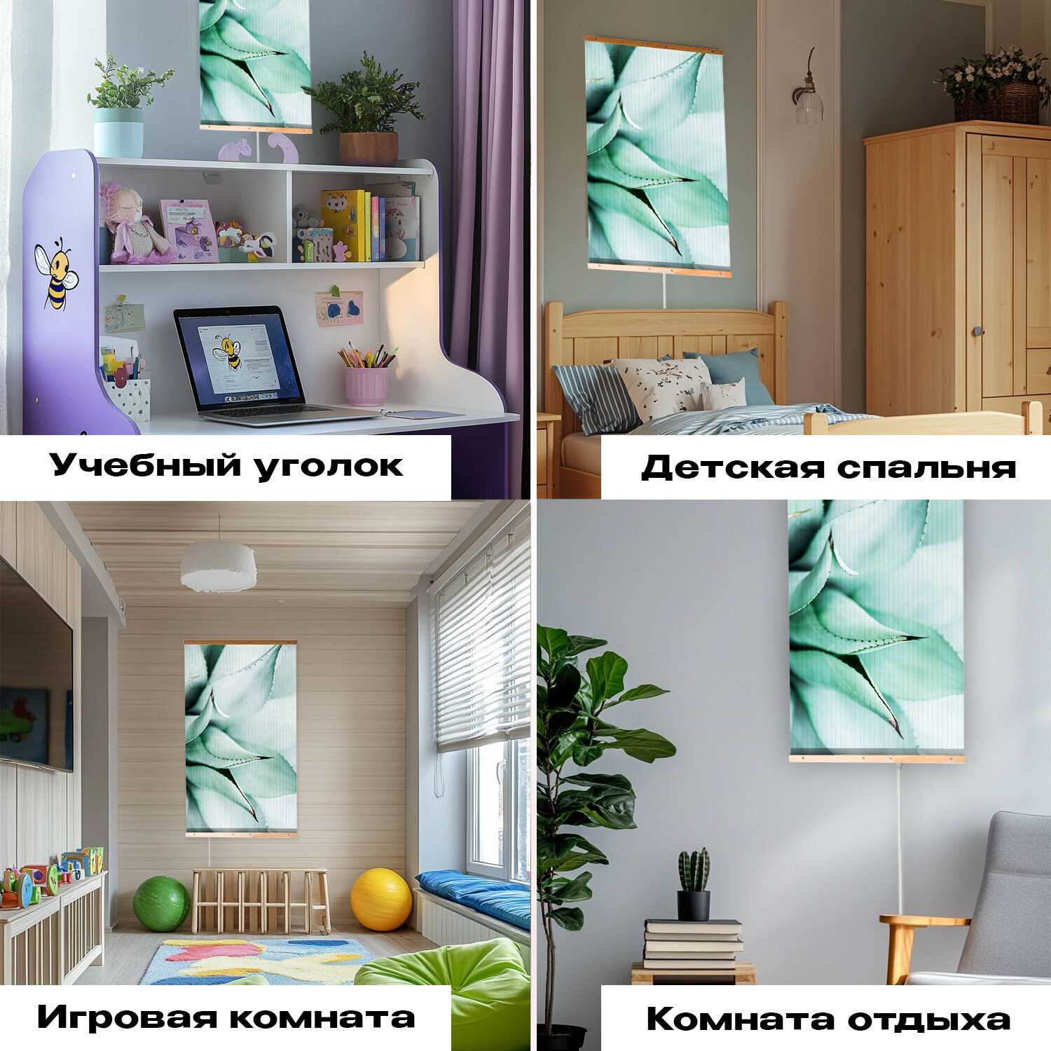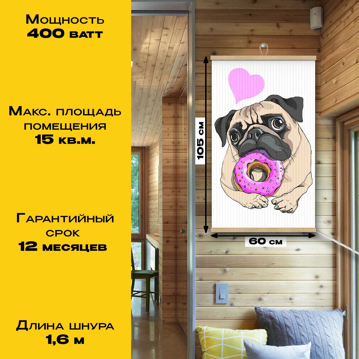 Настенный монтаж — ключевое преимущество: панель не занимает полезную площадь и интегрируется в декор как картина. Владельцы хвалят разнообразие принтов (от пейзажей до абстракций) и возможность подвеса под потолок. Однако провод расположен снизу, что неудобно при верхних розетках — требует удлинителя.