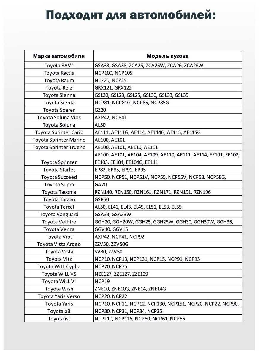 | Модель автомобиля : | Toyota Avensis, Toyota Auris, Toyota Land Cruiser Prado, Toyota Camry, Toyota Corolla, Toyota RAV4, Toyota Yaris, Toyota Carina, Toyota Corona |