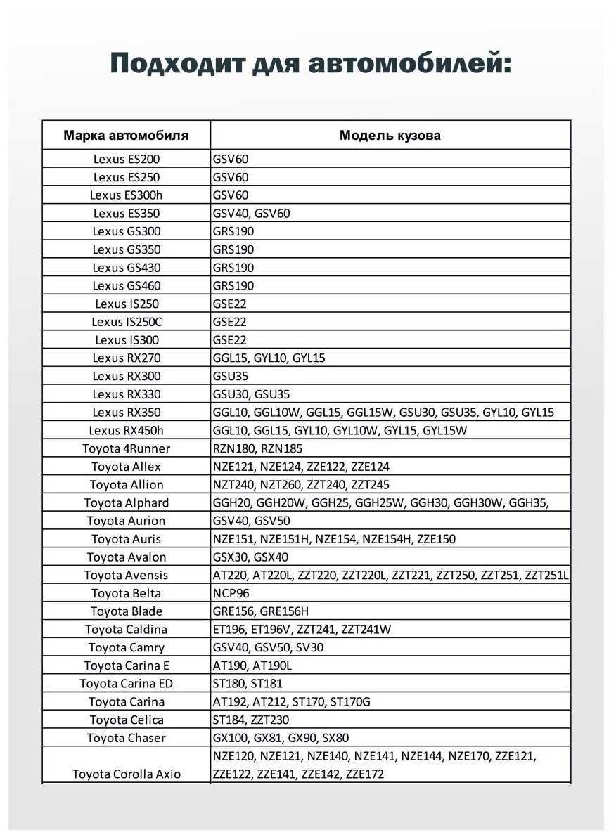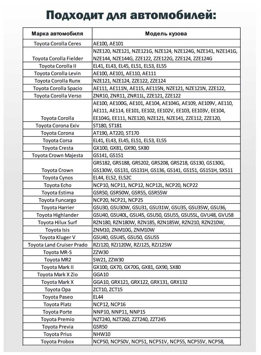 Модель автомобиля : | Toyota Avensis, Toyota Auris, Toyota Land Cruiser Prado, Toyota Camry, Toyota Corolla, Toyota RAV4, Toyota Yaris, Toyota Carina, Toyota Corona |