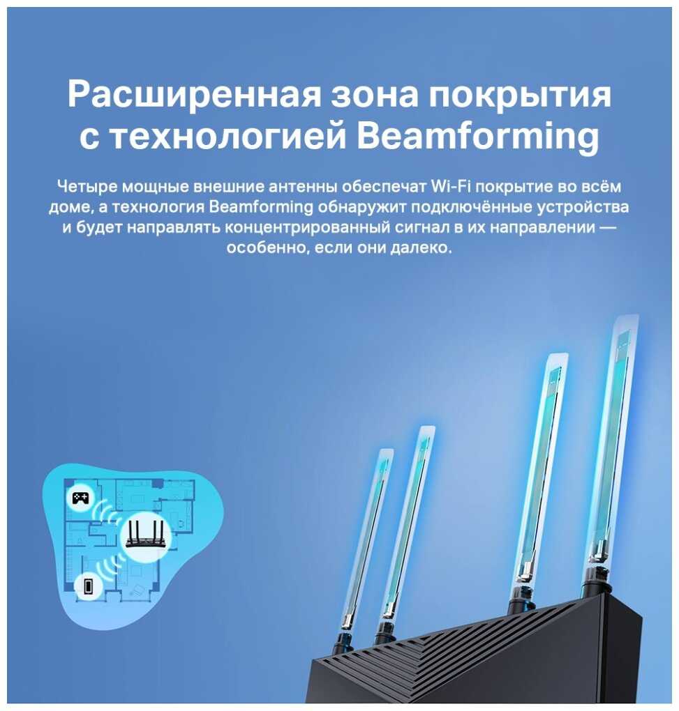 - Технология Beamforming фокусирует сигнал на подключенных устройствах, усиливая стабильность.