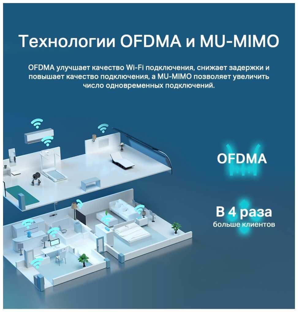 - Поддержка OFDMA и MU-MIMO улучшает распределение трафика между клиентами.