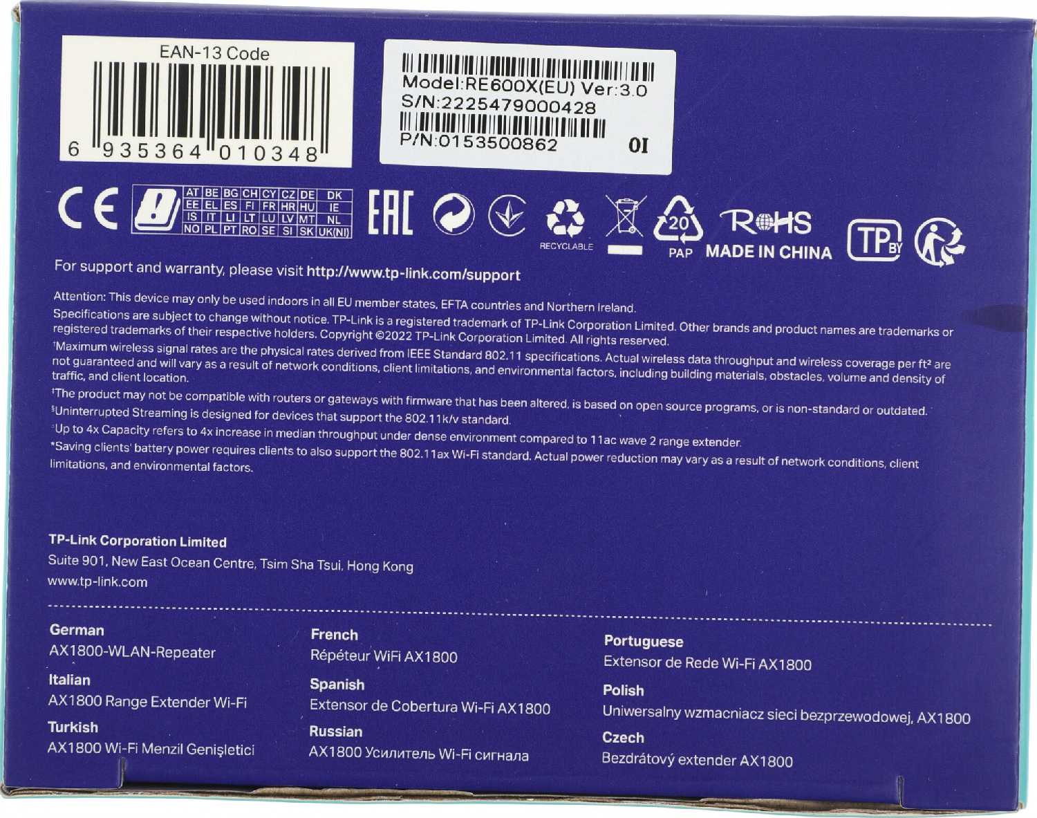 Характеристи TP-LINK Повторитель беспроводного сигнала RE600X