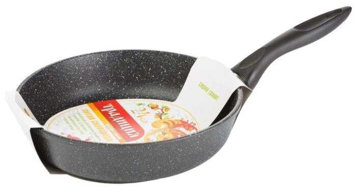 Сковорода «Традиция Гранит» — удачный выбор для тех, кто ценит равномерный прогрев и готов мириться с её недостатками ради качества жарки. Основное преимущество — многослойное дно толщиной 6–7 мм, которое обеспечивает стабильную температуру даже при тушении или приготовлении соусов. Это особенно оценят любители томлёных блюд: овощи не пригорают, мясо не «высушивается». Антипригарное покрытие уровня Granitium превосходит аналоги в бюджетном сегменте: как минимум 1.5 года активной эксплуатации без потери свойств при условии использования деревянных или силиконовых лопаток.