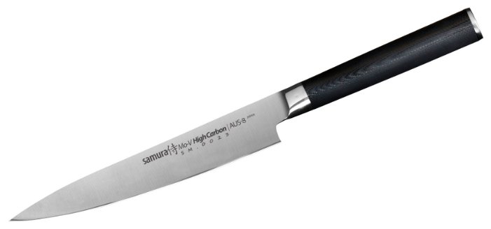 - Лезвие из высокоуглеродистой стали, тонкое и гибкое, позволяет наточить до идеальной остроты.