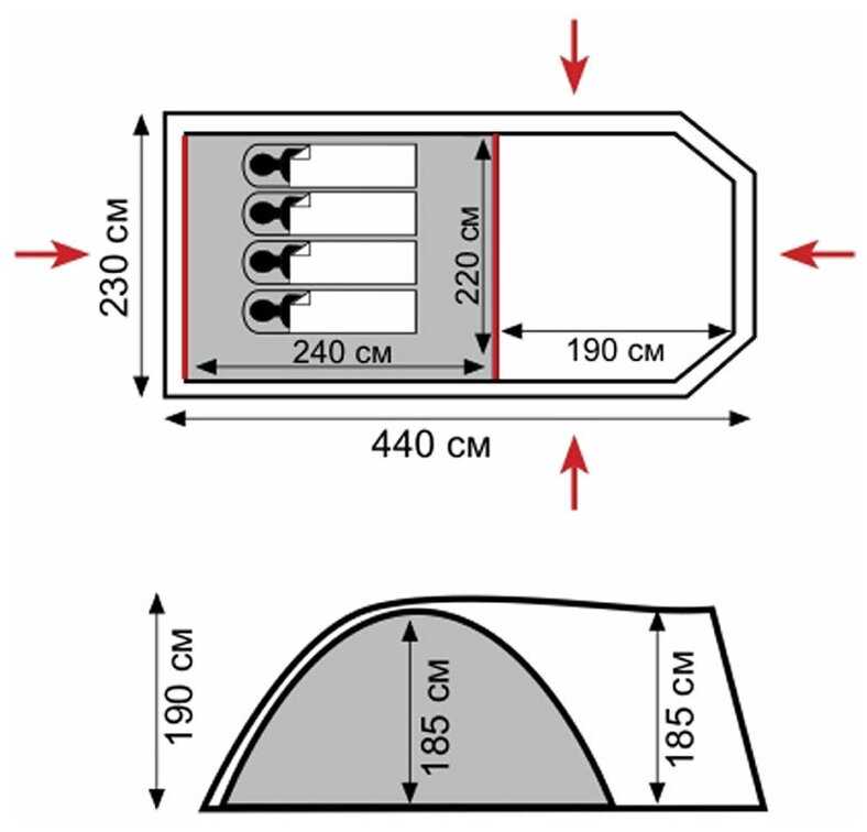 - + Вместительная, комфортная. Вход с любой стороны. Карманы во внутренней палатке, и в снаружи в тамбуре.
