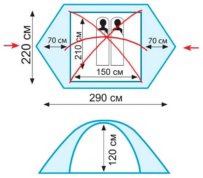 2 надувных коврика шириной 60 см входят почти впритык. - - Таскать булыжники для крепления колышков на сыпучем грунте и придавливания юбки, чтобы не унесло вместе с палаткой, но это не её проблема :)