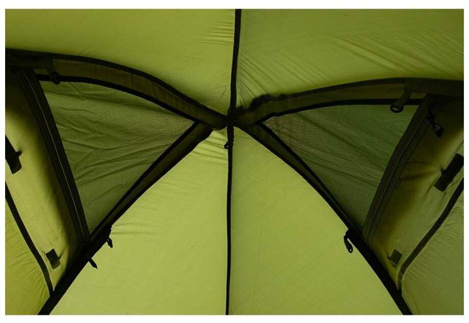 Возможно немного тяжелее обычных палаток, но однозначно более устойчива к непогоде. Выдерживает ураганы и сильный дождь. Все швы дополнительно проклеены, ничего внутрь не затекает. Места в палатке достаточно для двух взрослых человек, спится комфортно. Все входы-выходы и окна открываются прямо из палатки.