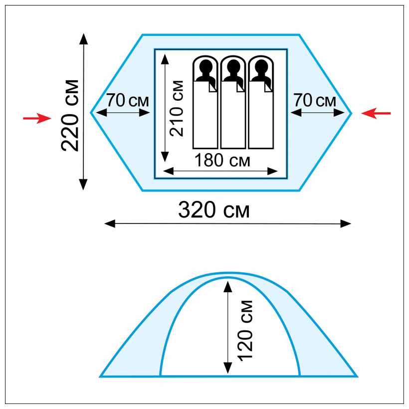 Палатка устойчива к ветровым нагрузкам при правильной установке, но в большинстве походов при установке не использовали оттяжки, просто 4 колышка для крепления тента и все отлично. - - Палатка хоть и заявлена как 3-ка, но с комфортом можно разместиться только в 2-м + ребенок. Если Ваш рост больше 180 см, вам возможно не хватит длинны спального места (стенка будет близко к лицу, что может создать дискомфорт).