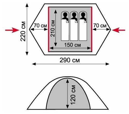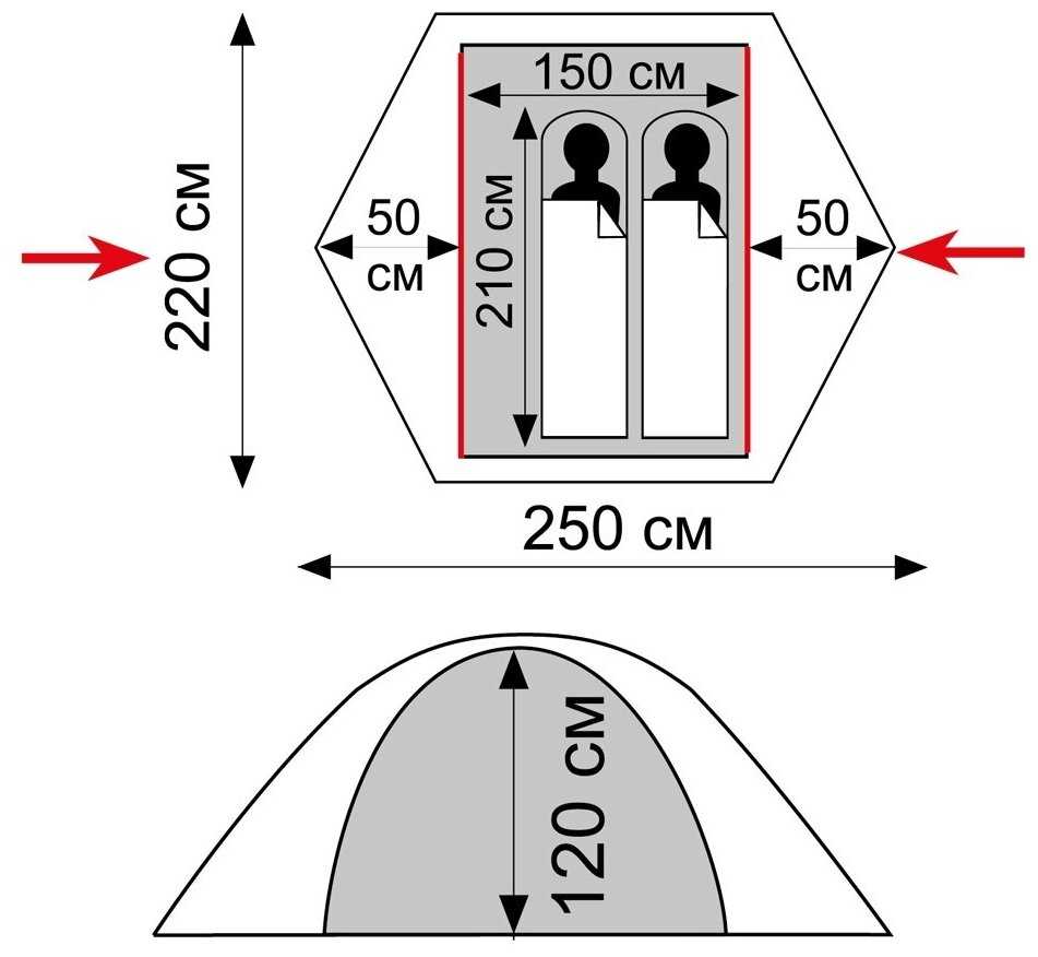 - быстро собирается и разбирается, буквально минут за 5 - - - оба входа/выходы расположены не со стороны ног, а по бокам палатки.