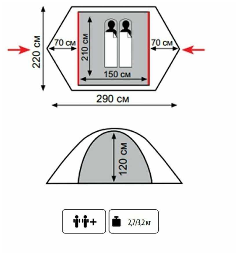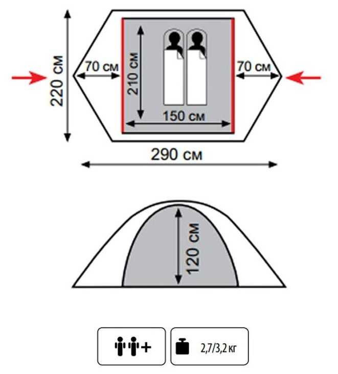 Палатка рассчитана на комфортное размещение двух взрослых. При добавлении третьего человека, особенно ребёнка, пространство становится тесным. Некоторые пользователи отмечают, что троим взрослым спать возможно, но это требует плотной укладки снаряжения и ограничивает свободу движений. -